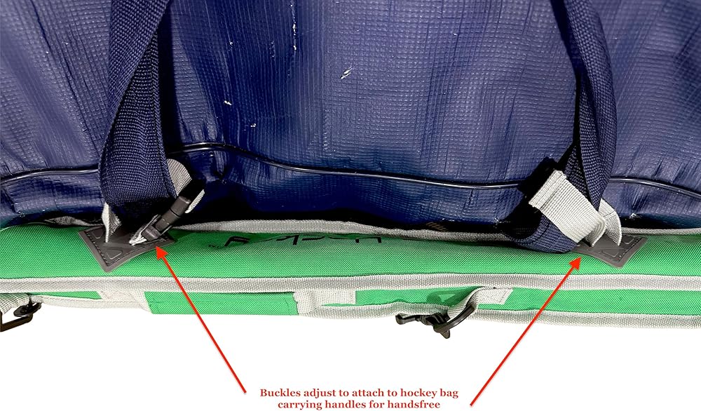 (ATTACHMENT) Only bag to feature a hockey bag latching system for a hands free carrying system. Attaching to the hockey bags handle, carrying straps. Buckles clips on, so you can roll your suitcase in the airport.