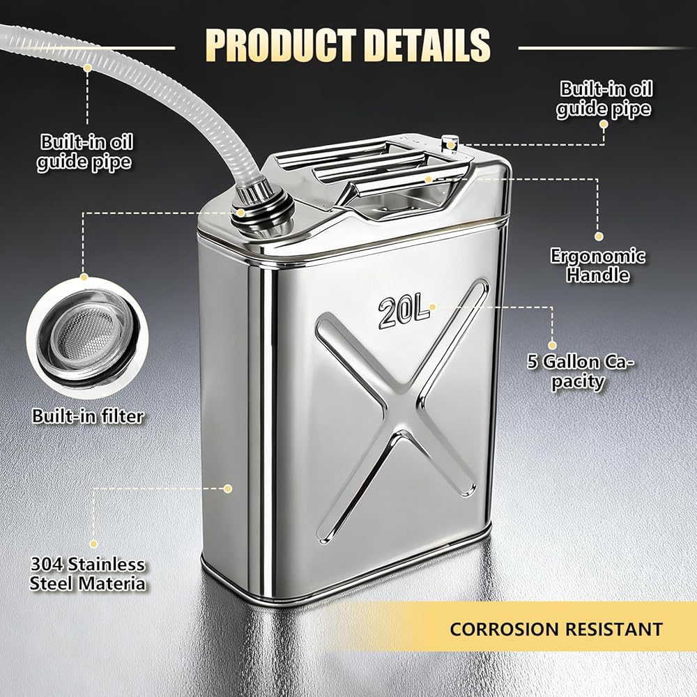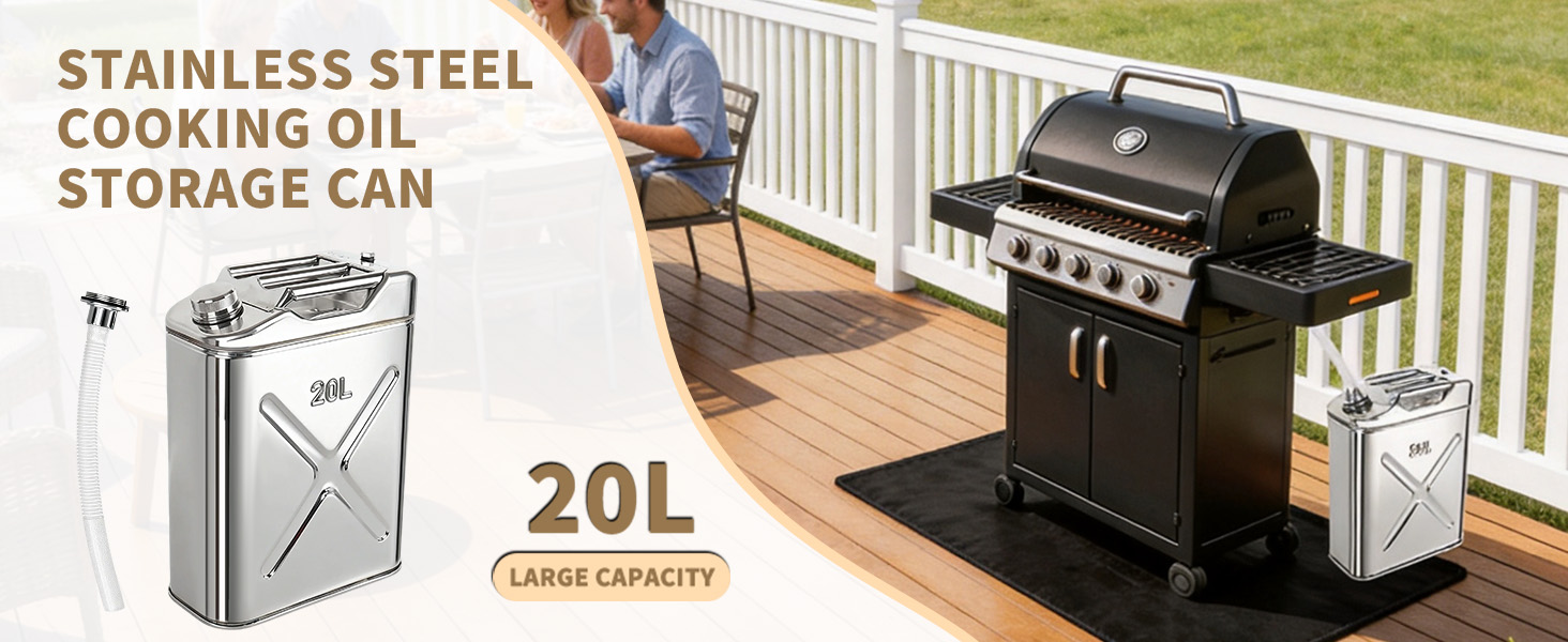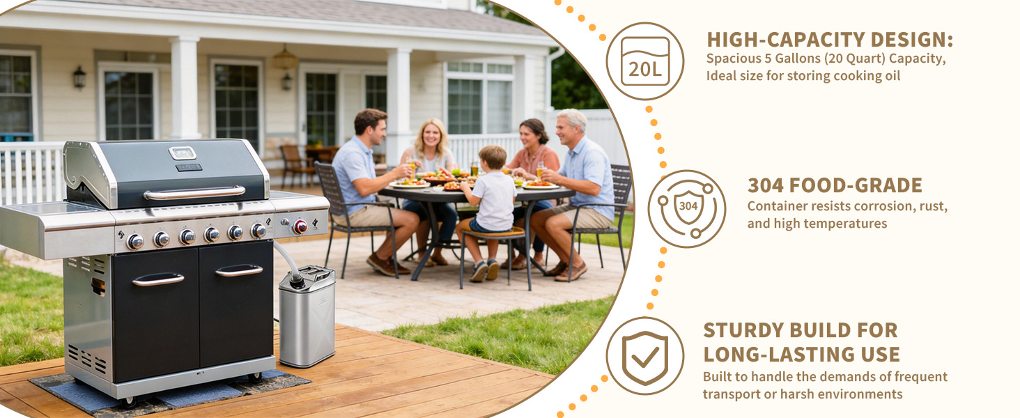 مصممة لتدوم طويلاً: مصنوعة من الفولاذ المقاوم للصدأ بدرجة 304 الممتاز الآمن غذائيًا، هذه الحاوية تقاوم التآكل والصدأ ودرجات الحرارة المرتفعة، مما يضمن التخزين الآمن للزيوت والسوائل الصالحة للأكل.