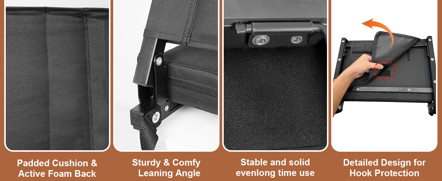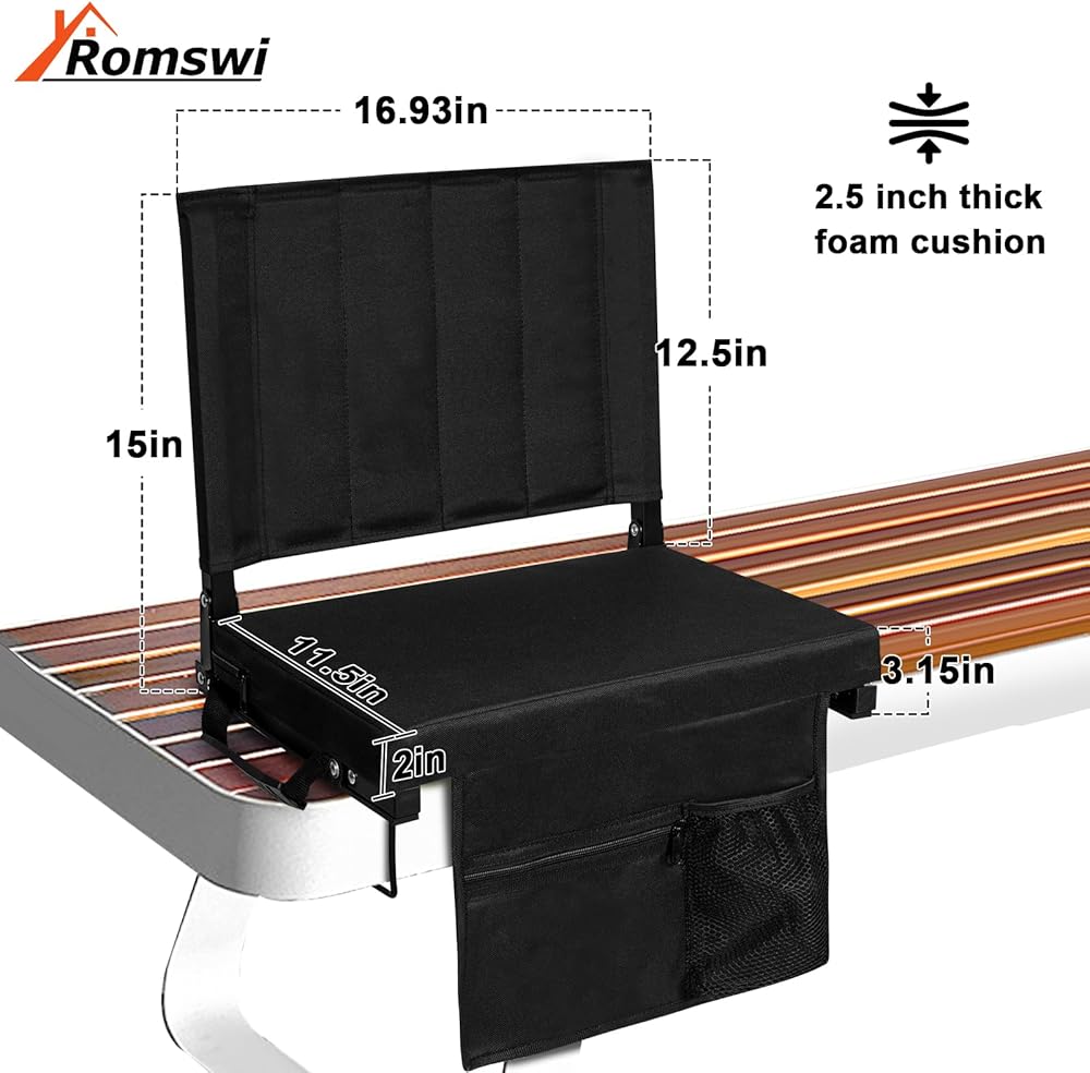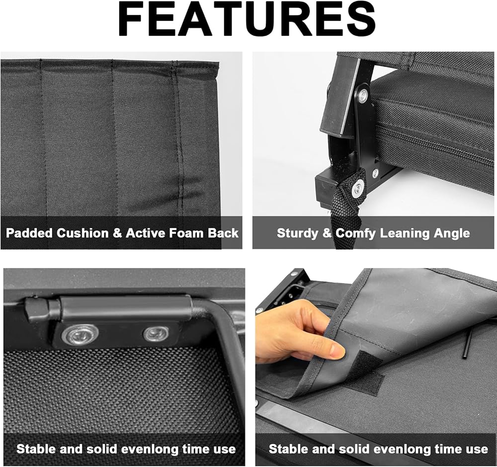 راحة فخمة وسميكة: تمتع براحة فائقة مع مقعد الاستاد الخاص بنا، والذي يتميز بوسادة مليئة بإسفنجة عالية المرونة بسمك 2 بوصة. مقترنًا بمسند ظهر مريح ومبطن بسخاء مقاس 12.5 بوصة، ويوفر نعومة تشبه السحابة وراحة كاملة وداعمة، مما يحول المبيضات الصلبة بشكل فعال إلى عرش شخصي مبطن.