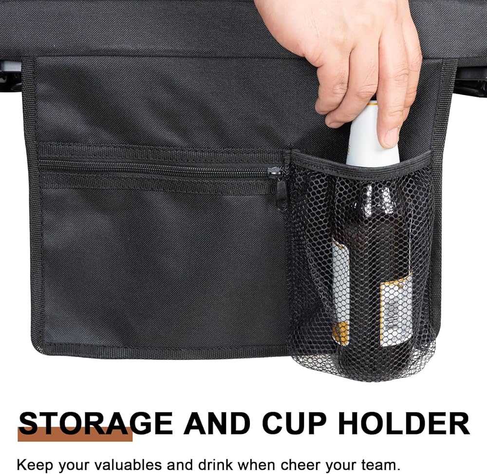 حامل أكواب وجيب تخزين للأساسيات: مزود بحامل أكواب وحقيبة تخزين بسحاب، يحافظ هذا المقعد على مشروباتك وأغراضك الشخصية - مثل هاتفك - آمنة وفي متناول اليد أثناء الألعاب أو الأحداث أو الأنشطة الخارجية. كل ما تحتاجه يمكن الوصول إليه دون مقاطعة تجربتك.