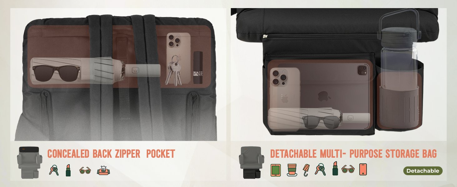 【جيوب تخزين متعددة قابلة للإزالة】 مجهزة بحاملي أكواب، وجيوب جانبية واسعة لأساسيات الحفلة الموسيقية الخاصة بك، وجيب خلفي، وجيب كبير بسحاب أسفل المقعد لسهولة الوصول. يمكن إزالة الجيوب بسهولة عند عدم استخدامها للحصول على مظهر نظيف وانسيابي.