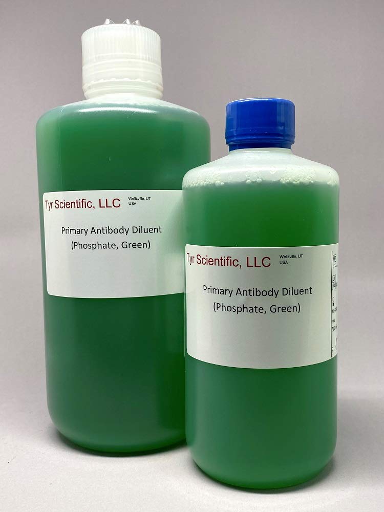 Provided as a ready-to-use (Phosphate Buffered) diluent containing green dye for diluting primary antibodies and for use as a negative control. Both monoclonal and polyclonal antibodies are stabilized for long-term storage thereby reducing the number of titrations required from concentrated form. Not for antibodies that have been conjugated with peroxidase. In most cases, antibodies diluted in this reagent can be stored for 24 months at 2-8°C. Diluent is subjected to 0.2 micron filtration. pH 7.4