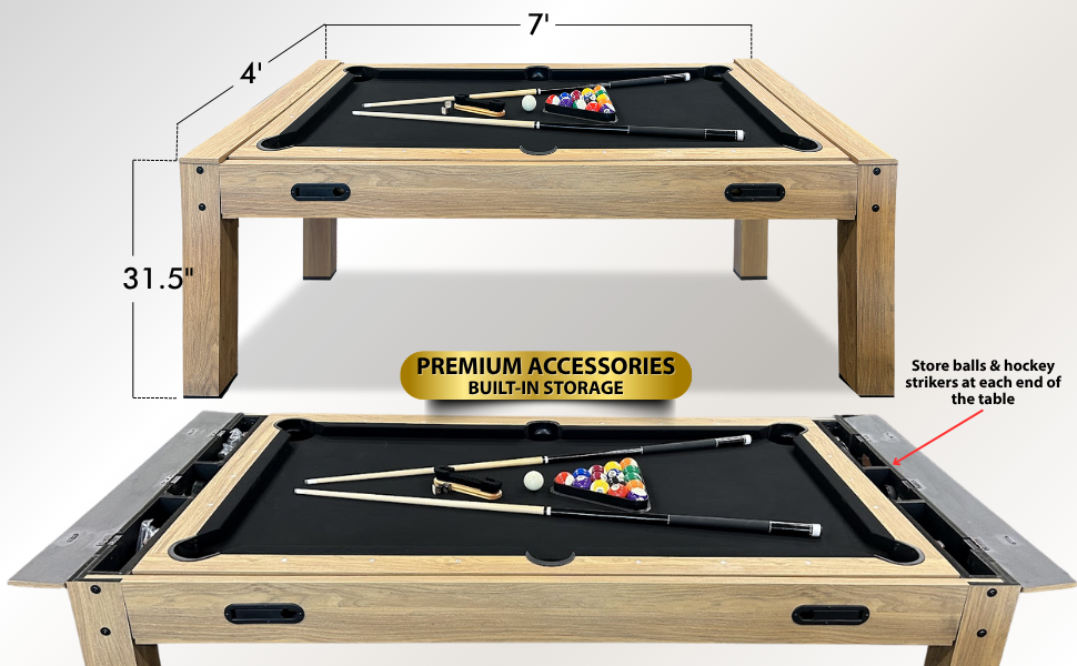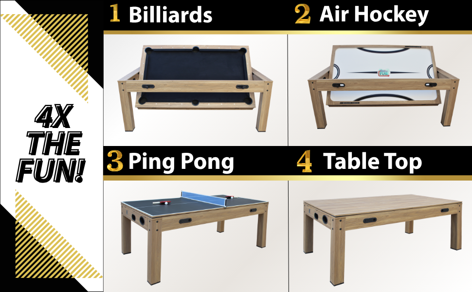 متعددة الوظائف - العب البلياردو والهوكي الهوائي وتنس الطاولة أو استخدم سطح الطاولة الواسع لتناول الطعام أو الحفلات أو الحرف اليدوية. قفل فريد، تصميم دوار يسمح لك بالتدوير بين البلياردو والهوكي الهوائي في ثوانٍ. تشتمل الطاولة على سطح طاولة متشابك مكون من قطعتين مع كرة بينج بونج على جانب واحد ومكان لتناول الطعام/الحرف اليدوية على الجانب الآخر. تعمل أربع دعامات قفل متكاملة على تثبيت كل لعبة في مكانها، بحيث تكون مستقرة ومستوية.