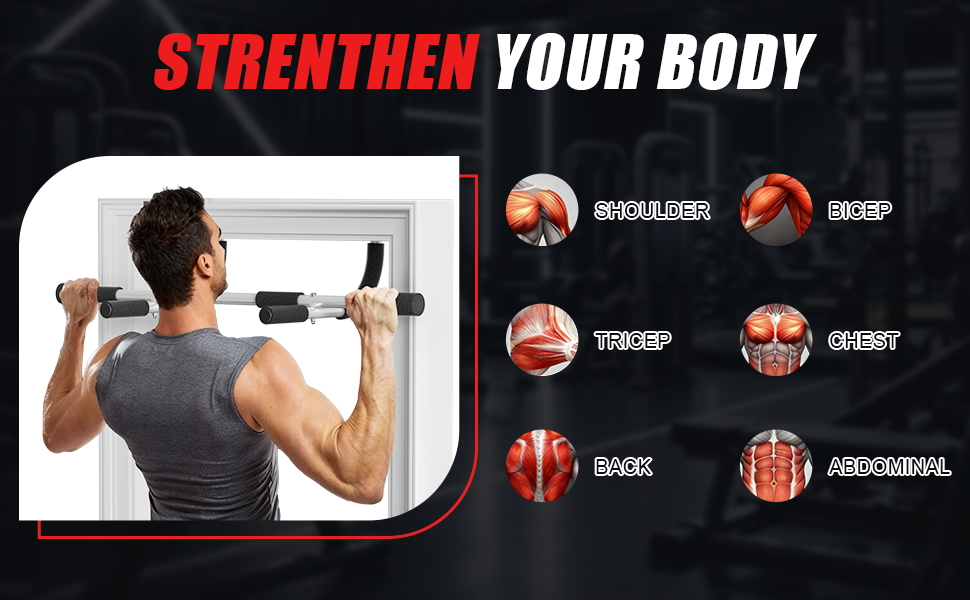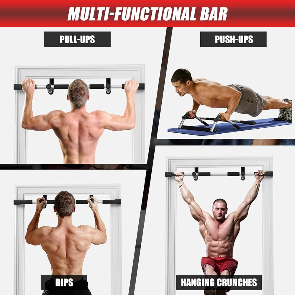 شريط تمرين متعدد الوظائف: شريط سحب اللياقة البدنية متعدد الوظائف هذا أكثر من مجرد جهاز سحب واحد. يدمج تصميمه الذكي بنجاح وظائف الصالة الرياضية الأساسية المتعددة في وظيفة واحدة. إلى جانب عمليات السحب القياسية، فإنه يدعم أيضًا عمليات السحب ذات القبضة الواسعة والجلوس والضغط بالإضافة إلى تمارين الذراع والكتف. مع الاستخدامات المتعددة في شريط السحب هذا، يمكنك بسهولة بناء صالة الألعاب الرياضية المنزلية الخاصة بك في جميع أنحاء المنزل وتحقيق تدريب شامل وفعال للجزء العلوي من الجسم والعضلات الأساسية.