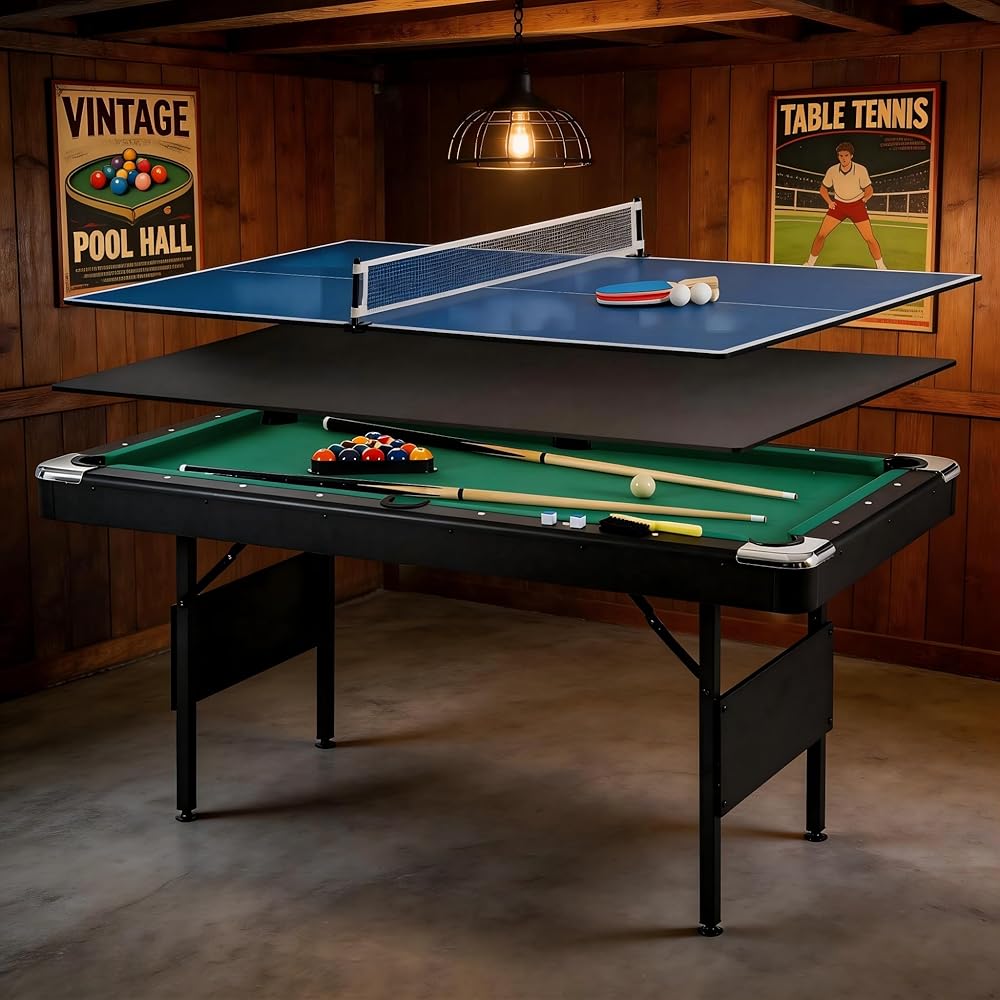 [Complete Accessories Included]: Comes ready with billiard balls, triangle rack, chalk, brush, table tennis balls, paddles, net, and posts, allowing you to enjoy billiards and table tennis immediately after setup.