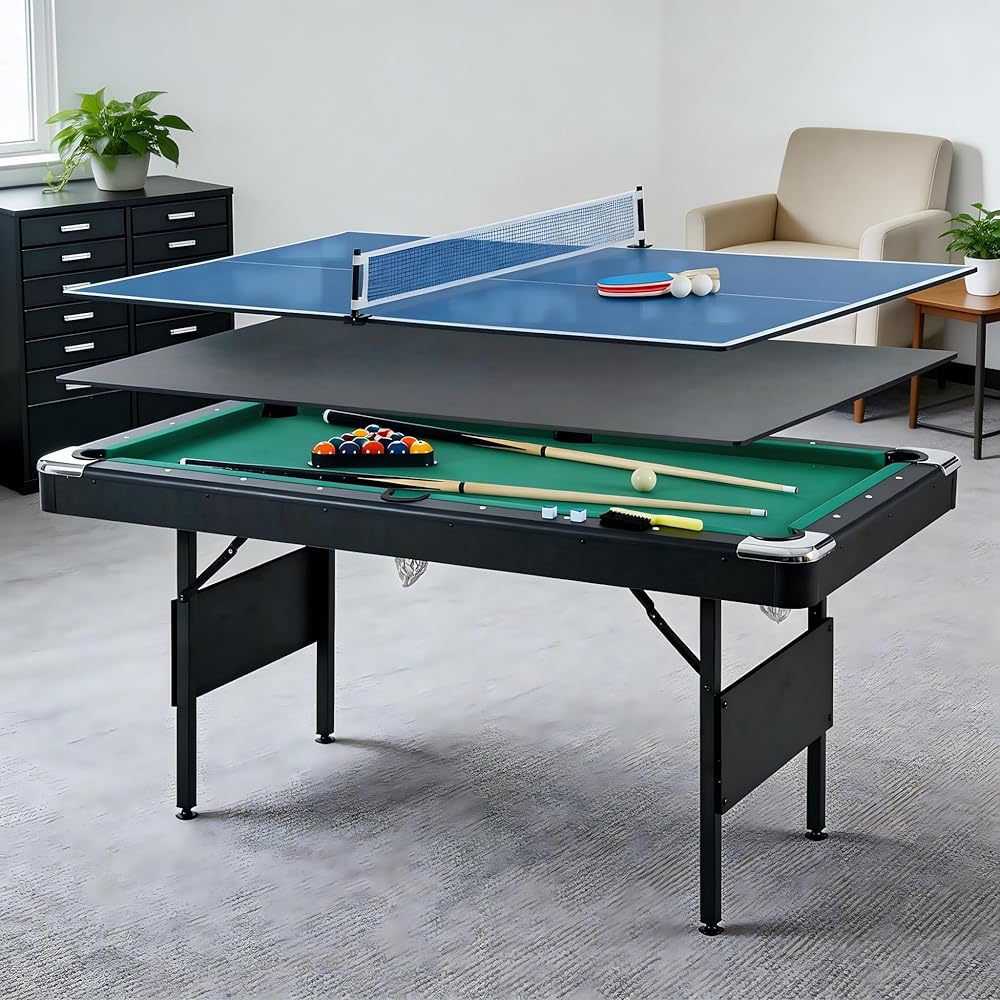 3 in 1 multi game table combining billiards and table tennis. Foldable, space-saving design with full accessories, durable MDF structure, and ideal for family indoor entertainment.