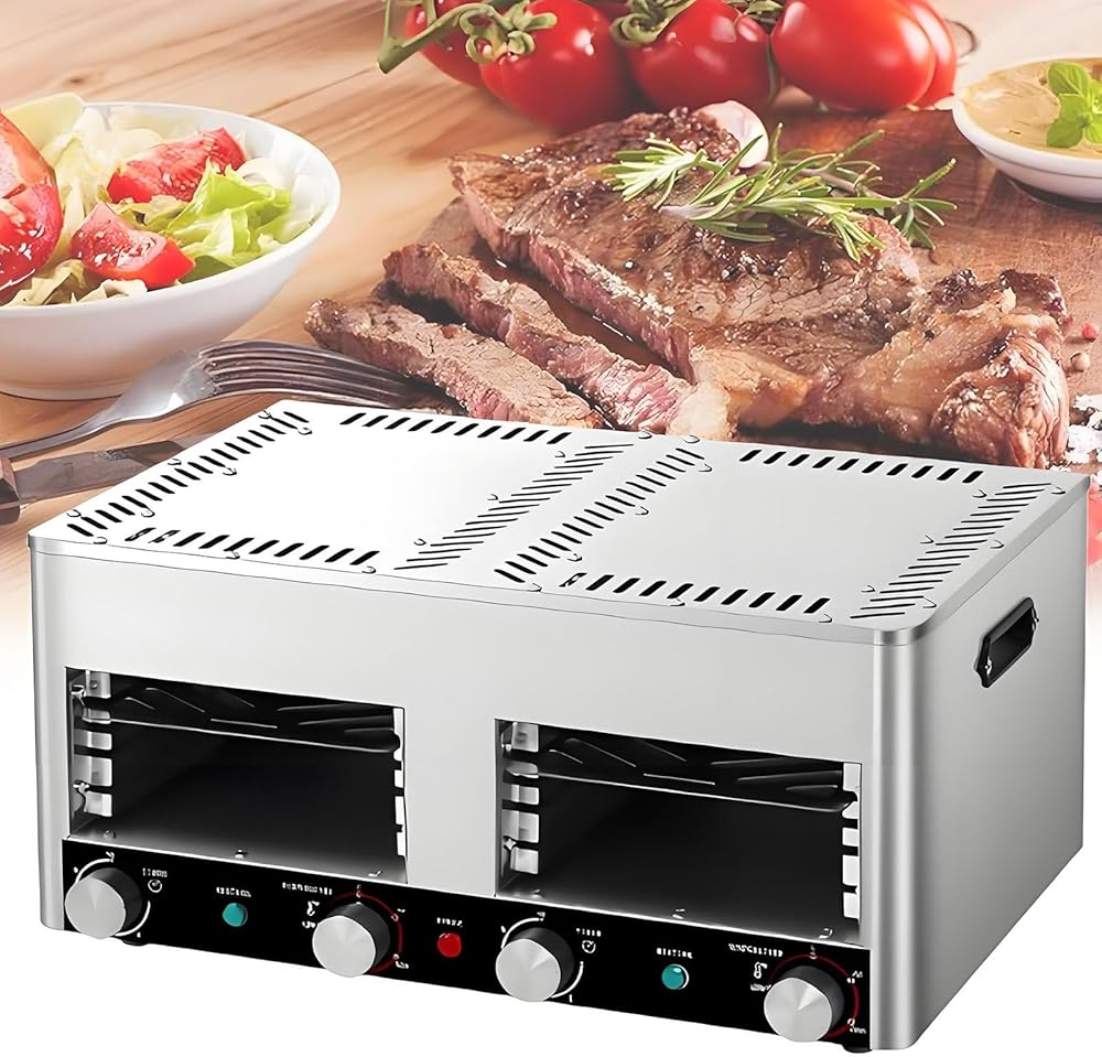 • 【Electric Heating Design】The steak grill adopts an electric design, without gas, which greatly enhances safety and environmental protection. A thick-cut steak can be grilled in just 40 seconds to 60 seconds on one side, and the grill is detachable and washable after use, allowing you to focus on cooking without worrying about cleaning.