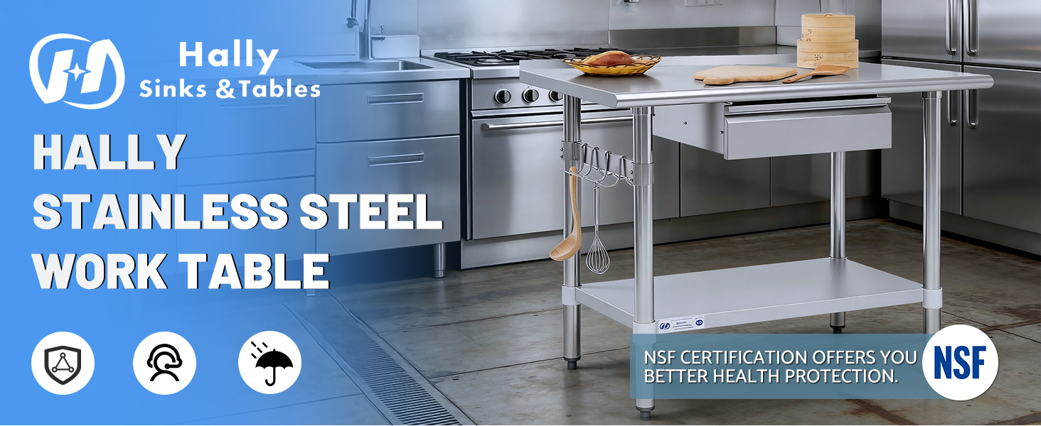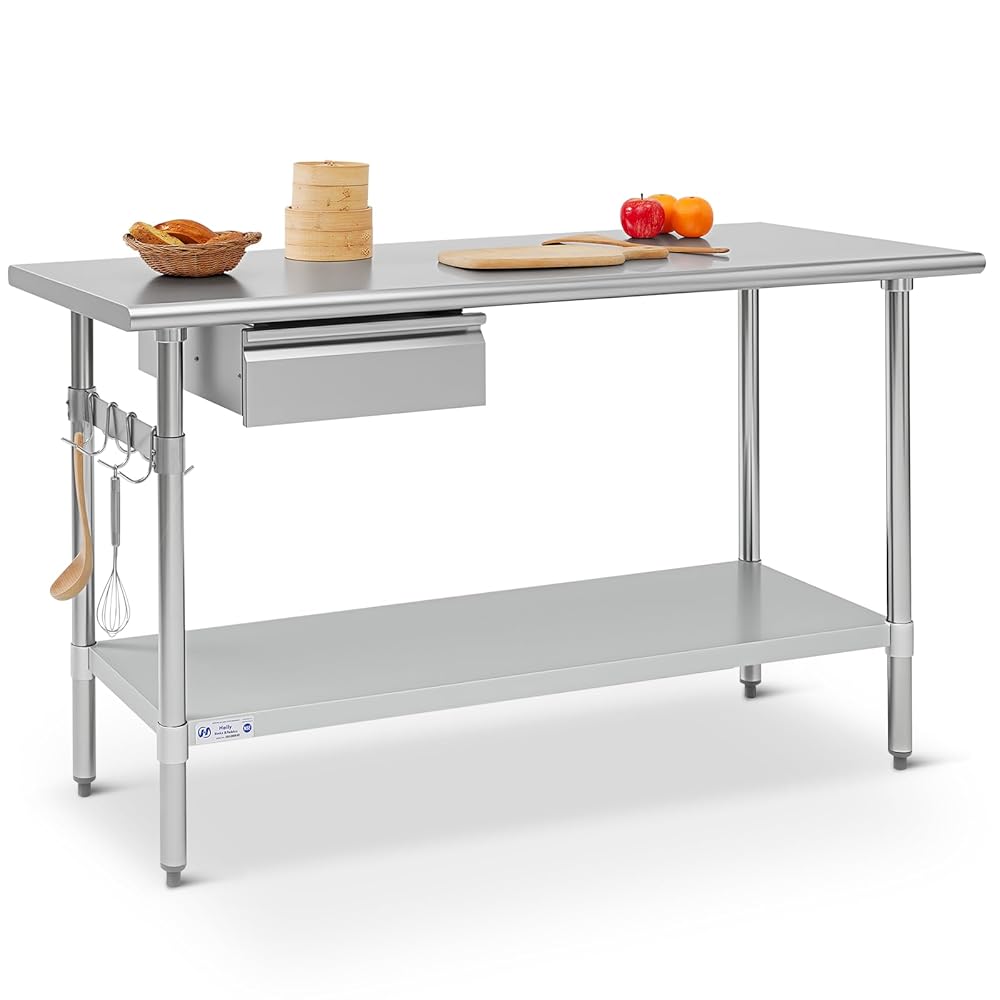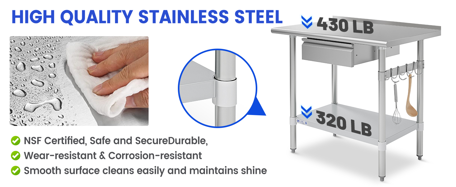 سطح عمل شديد التحمل من الفولاذ المقاوم للصدأ: مصنوع من سطح طاولة متين من الفولاذ المقاوم للصدأ، توفر طاولة التحضير مقاس 24 × 60 بوصة محطة عمل واسعة وموثوقة لإعداد الطعام ومهام المطبخ والتخزين واستخدام المرافق اليومية. يدعم سطح الطاولة ما يصل إلى 480 رطلاً، مما يجعله مثاليًا لأواني الطبخ الثقيلة والأجهزة الصغيرة والمكونات والاستخدام التجاري اليومي.