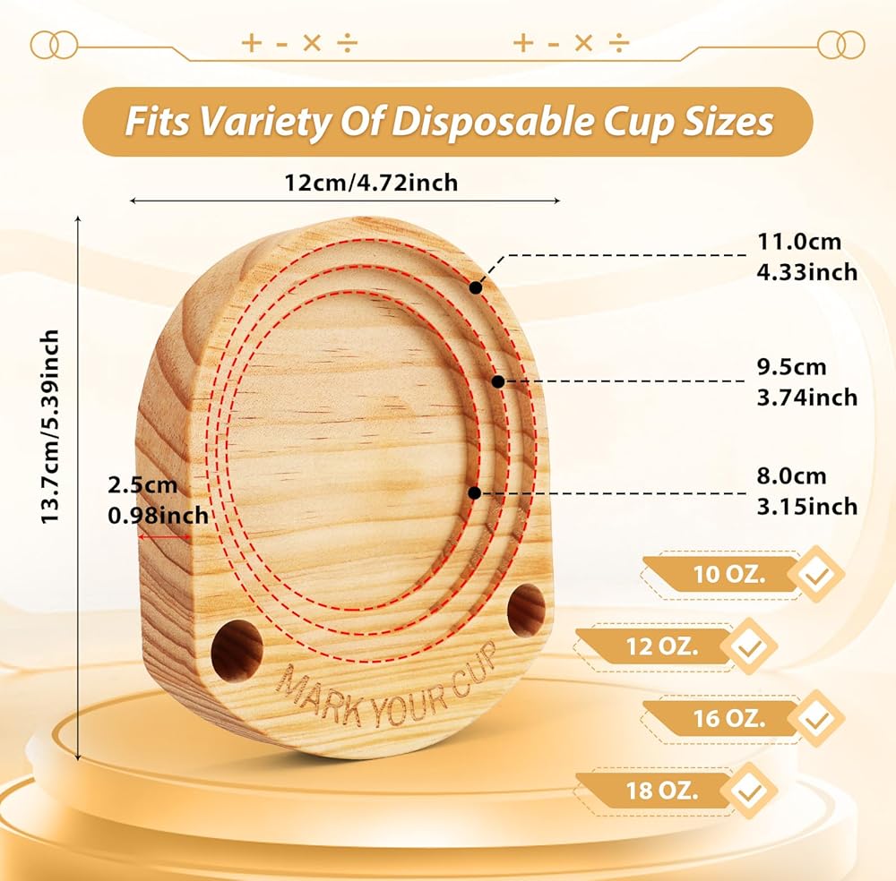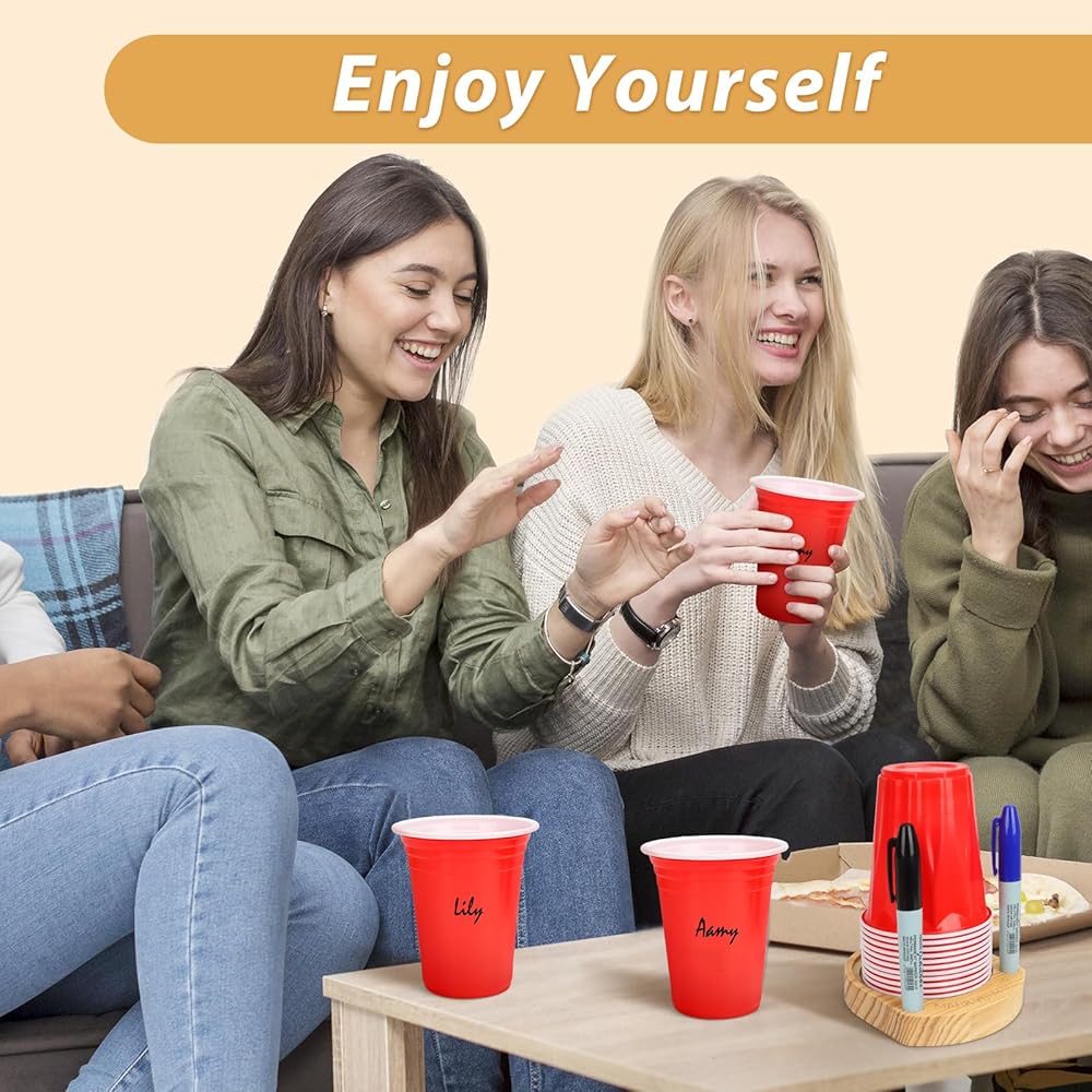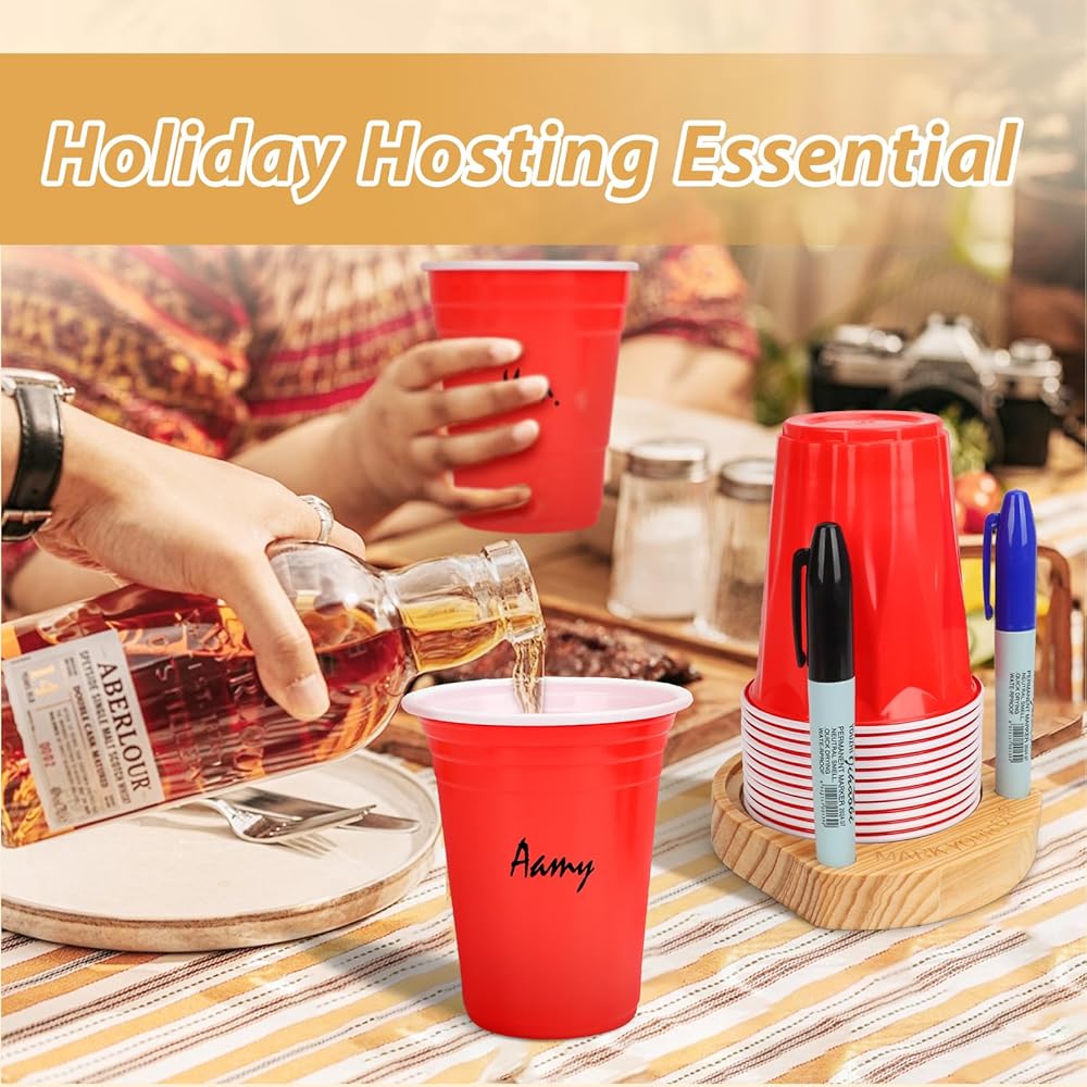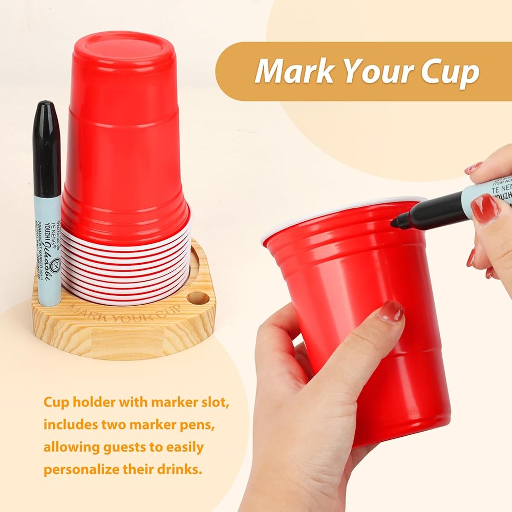 Get ready to elevate your hosting game with our wonderful party cup holder with marker slot, designed with fun and functionality in mind! Measuring approximately 5.5'' x 4.7'' x 1'', this compact cup organizer is perfect for keeping your plastic cups neatly arranged and easily accessible. Whether you're throwing a small get-together or a grand event, this wooden cup holder is your new best friend! Say goodbye to drink mix-ups! Our party cup holder with marker slot with two bright marker pens. Guests can personalize their drinks with a quick sketch or their name, ensuring everyone knows which cup is theirs. Plus, our lively engraving “MARK YOUR CUP” serves as a friendly reminder to keep the party rolling without confusion! Mark your cup and drink up cup holder. Hosting a festive gathering? This cup holder with marker is holiday hosting essential! Whether it's Christmas, birthdays, BBQs, or family reunions, you'll impress your guests with a well-organized and stylish beverage station. Picture it: one at the beginning of your buffet and another at dessert – your guests will love the convenience! Crafted from durable wood, this cup organizer not only offers practical functionality but also enhances your decor with its charming grace. wooden cup holder seamlessly blends into any setting while serving multiple purposes – it's your go-to paper cup dispenser,plastic cup dispenser, disposable cup dispenser and plastic cup holder with marker slot all rolled into one. No more worrying about mismatched cup sizes! Our party cup holder with marker slot accommodates a variety of disposable cups, from 10 oz to 18 oz – including plastic cups, paper coffee cups, shot glasses, and mouth cups. Perfect for any occasion, you can cater to all your guests' drink preferences with ease. With our Party Cup Holder with Marker Slot, your entertaining experience will be transformed into a fun, organized, and memorable affair!Don't miss out on the chance to impress your friends and family.