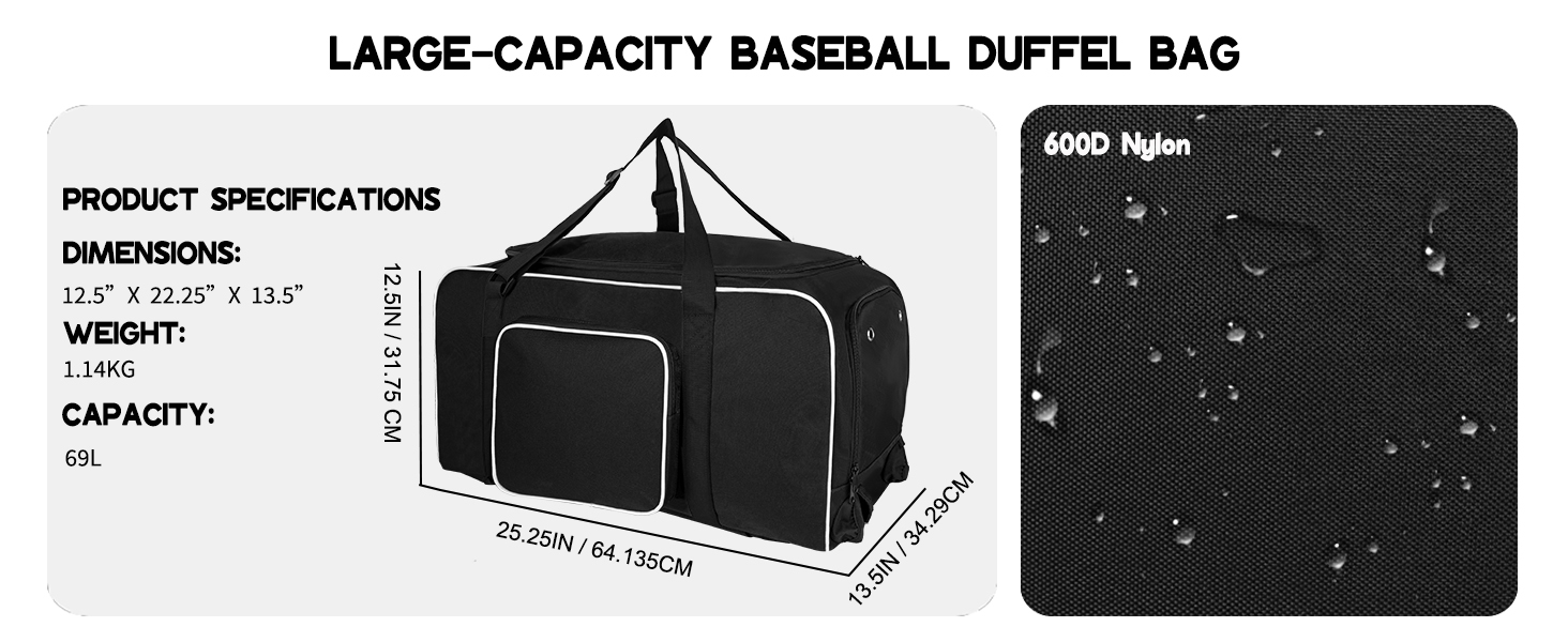 4. مادة بوليستر 600D متينة مقاومة للماء: مصنوعة من البوليستر الفاخر المقاوم للاهتراء والمقاوم للماء 600D، تتحمل حقيبة السفر البيسبول شديدة التحمل الاستخدام الخارجي القاسي والمطر والارتداء المتكرر. تضمن السحابات المعززة والخياطة القوية متانة طويلة الأمد، وتحمي معداتك الرياضية القيمة في جميع الظروف الجوية.