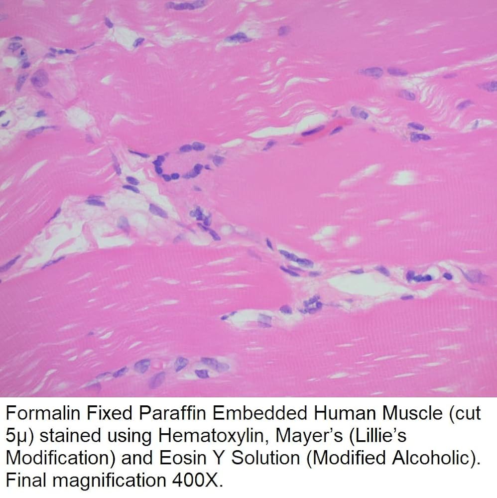 Eosin Y Solution (Modified Alcoholic) is intended for use in histology and cytology applications. Expected Results: Cytoplasm = Light Pink Collagen = Pink Muscle = Pink/Rose Erythrocytes = Pink/Red
