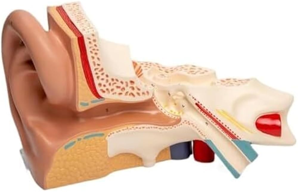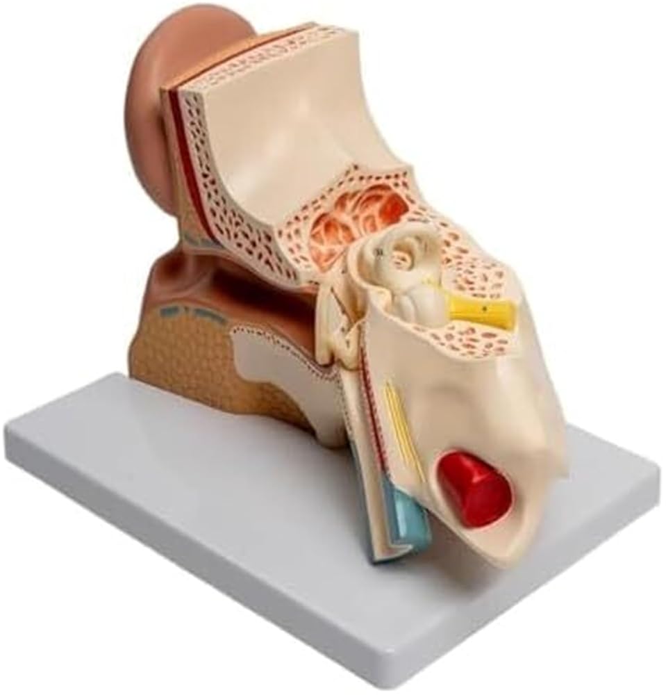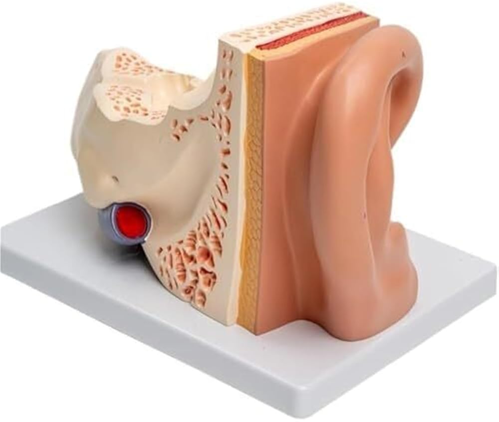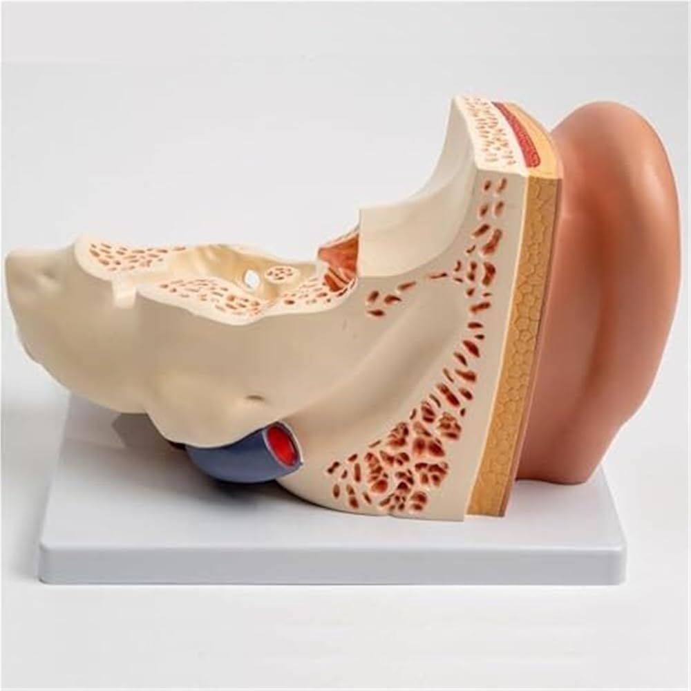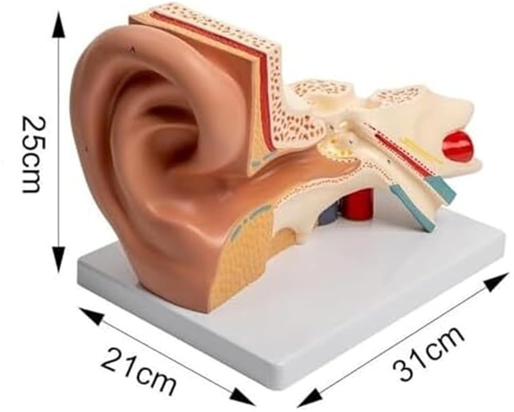 Product material: pvctype: anatomical modelproduct size: 31*21*25 cmear anatomical model structure:the model is enlarged three times and can be disassembled into three parts, including the outer ear, middle ear, temporal bone and inner ear labyrinth. the model shows the structure of the outer ear, external auditory canal, middle ear tympanic cavity, tympanic membrane and ossicles, eustachian tube, temporal bone and inner ear labyrinth. the tympanic membrane and labyrinth are detachable and equipped with digital markings and corresponding instructions for easy teaching and communication.