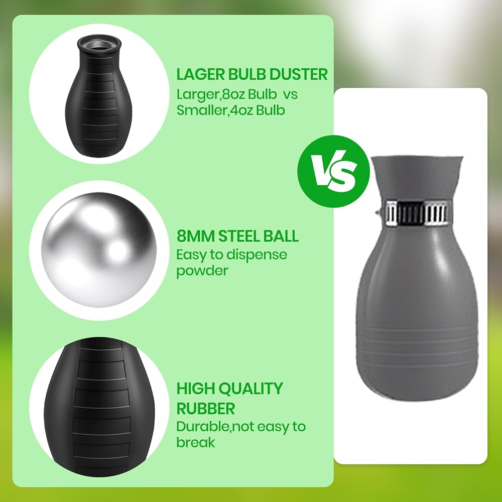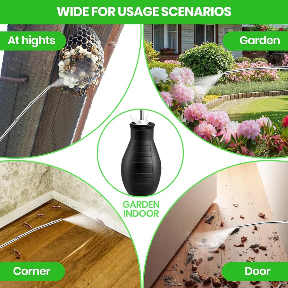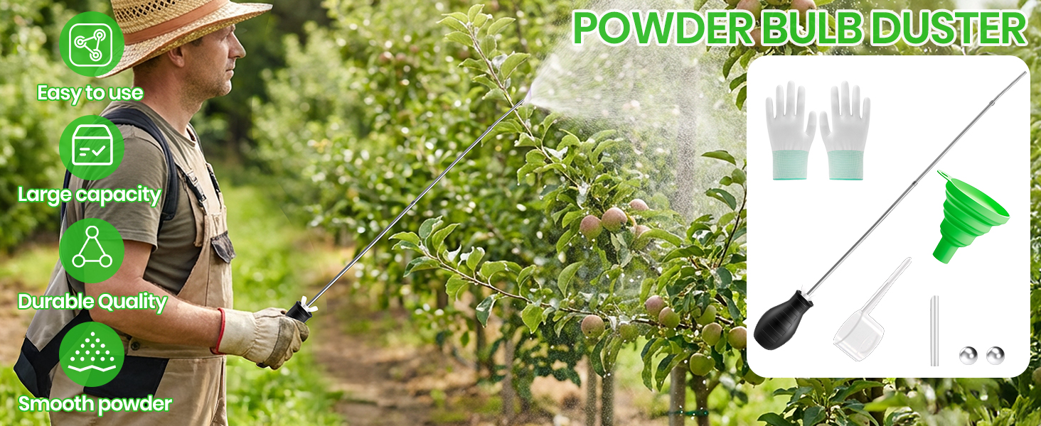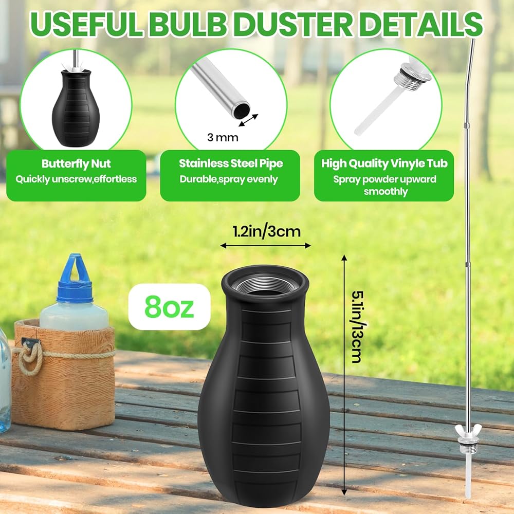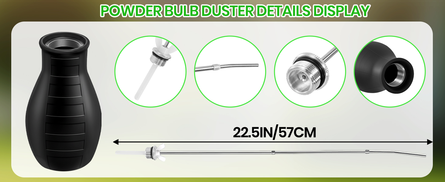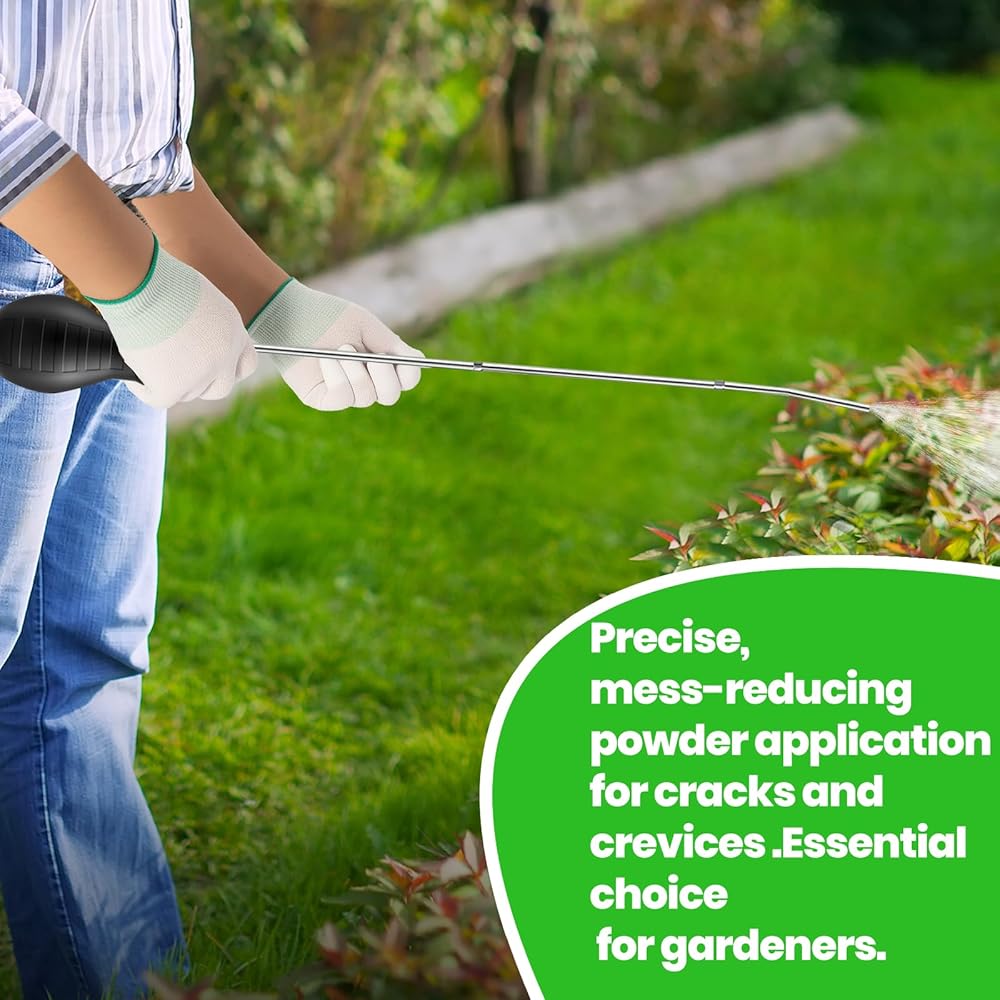 مساعد متعدد الاستخدامات للاستخدام الداخلي والحديقة: منفضة المسحوق هذه مناسبة لوضع التراب الدياتومي والمساحيق الدقيقة الأخرى المتوافقة في الشقوق، وفراغات الجدران، وألواح القاعدة، والخزائن، وأسرة الحديقة، والنباتات في أصص وأكثر من ذلك. أداة يدوية عملية للمنازل والشرفات والدفيئات الزراعية ومشاريع الحدائق الصغيرة.