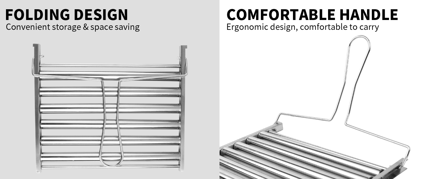 تصميم قابل للطي: المقبض الطويل يجعل من السهل دحرجة ونقل رف أسطوانة النقانق المصنوع من الفولاذ المقاوم للصدأ. كما أنه يقلل من الحروق. التنظيف بسيط ومريح للحمل.