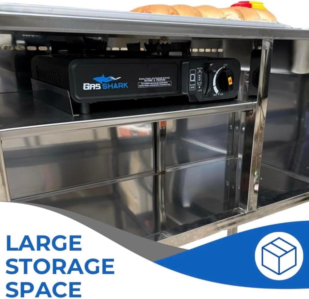 Transform your outdoor cooking experience with this professional-grade hot dog cart, perfect for both commercial vendors and home entertainment enthusiasts. The durable stainless steel construction ensures longevity while providing a sleek, professional appearance. The cart features a high-performance aluminum griddle and comes complete with a portable butane-powered stove, giving you the flexibility to cook anywhere. The thoughtfully designed layout includes ample storage shelf space underneath, making it easy to keep supplies organized and within reach. The cart's portable design allows for easy mobility, whether you're setting up at different locations for business or moving around your backyard during parties. The spacious cooking surface provides plenty of room to prepare multiple hot dogs simultaneously, while the sturdy frame ensures stability during operation. This versatile cart combines commercial-grade quality with user-friendly features, making it an excellent choice for anyone looking to serve up delicious hot dogs with style and efficiency.