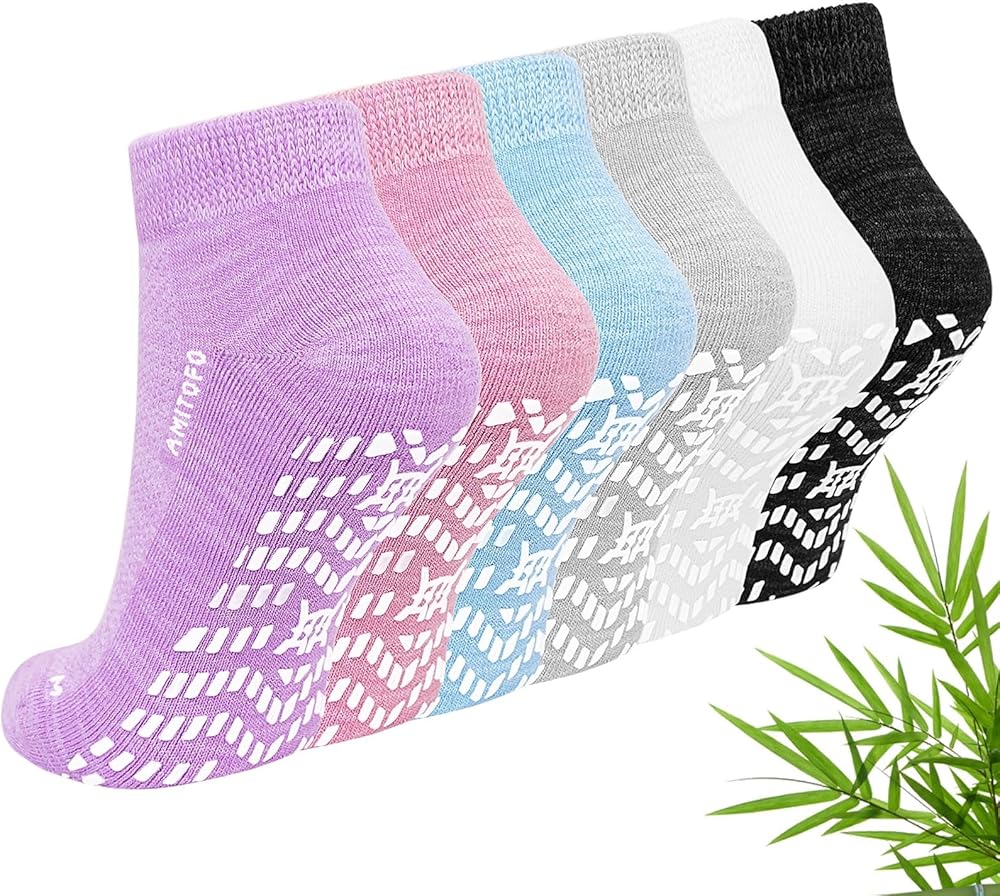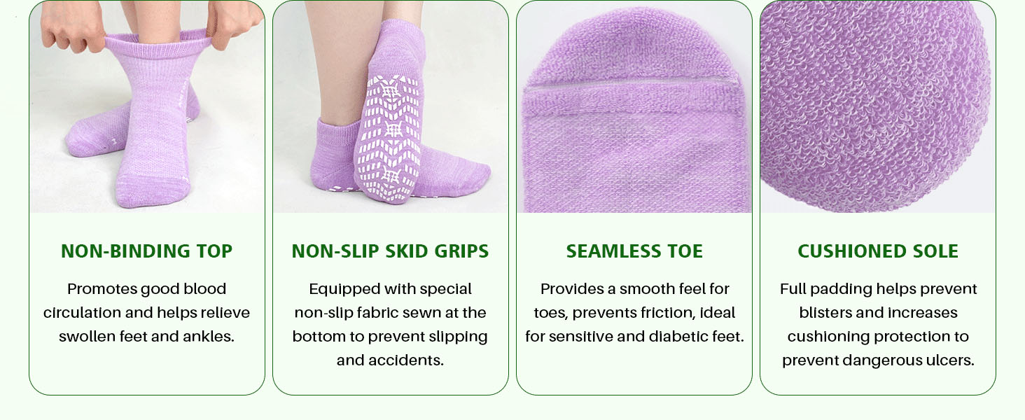 【جوارب للكاحل مضادة للانزلاق】تتميز جواربنا النسائية المضادة للانزلاق بنعال مطاطية أوسع وأكثر، مما سيعزز الالتصاق بين قدميك والأرضية، مما يضمن السلامة والثبات وتجربة عدم الانزلاق. هذه الجوارب المقبضة مثالية للأشخاص الذين يعانون من مرض السكري والاعتلال العصبي والوذمة ومشاكل الدورة الدموية، كما تجعلك تمشي أو تمارس التمارين على أرض ناعمة بسهولة.
