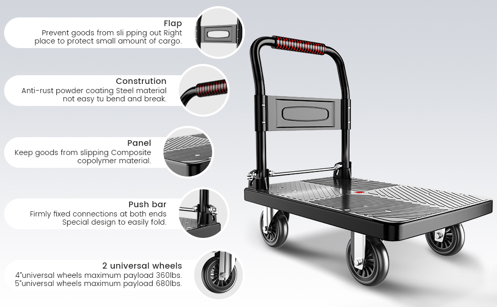【قوية ومتينة】: تتميز عربة الدفع هذه ببنية تحمل سميكة بسعة 980 رطلاً + عجلات من البولي يوريثان مقاس 5 بوصات (عجلات تقليل الضوضاء). نقل البضائع بسهولة من منطقة إلى أخرى دون كسر ظهرك. لقد صممنا هذه العربات المتحركة باستخدام مواد عالية الجودة لضمان متانة إضافية واستخدام أطول.
