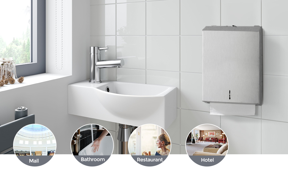 درجة تجارية وعالية السعة: مصنوع من الفولاذ المقاوم للصدأ SUS304، يمكن لموزع مناشف الحمام الورقية التجاري هذا استيعاب 320 منشفة مطوية (متوافقة مع مناشف Tork وScott وKleenex وAmazonCommercial وMarothon وPacific متعددة الطيات؛ ويناسب المقاسات في حدود 4*10 بوصة). ويضمن منفذه الواسع توزيعًا خاليًا من المربى، وهو مثالي للأماكن ذات حركة المرور العالية مثل الفنادق والمدارس والمطاعم والمكاتب.