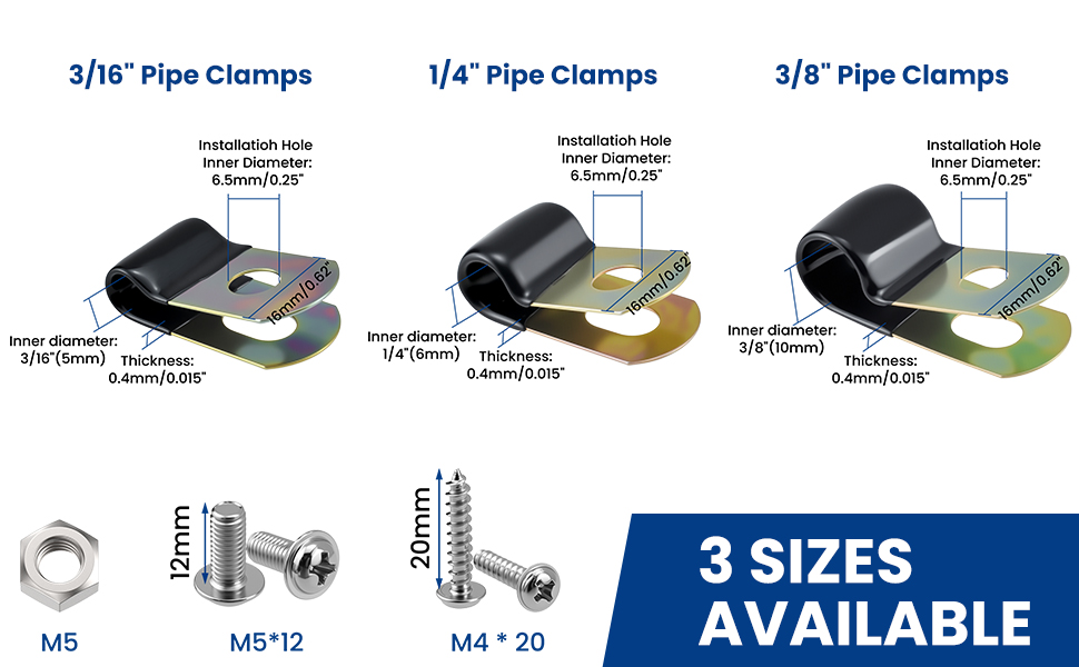 سوف تحصل على 30 قطعة من مشابك الأنابيب مقاس 3/16 بوصة، و30 قطعة براغي ذاتية اللولبة، و10 قطعة برغي آلة برأس مستدير، و10 قطعة صواميل
