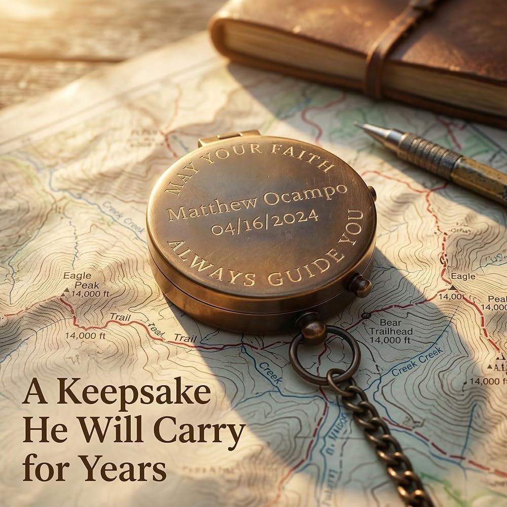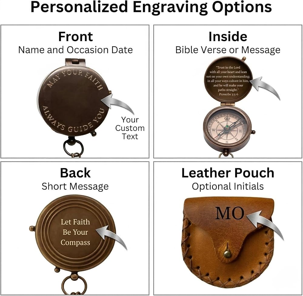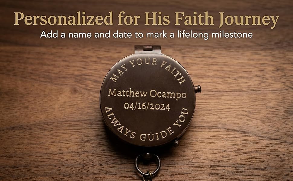 • 【تذكار التأكيد للأولاد】منقوش خصيصًا بالاسم، أو الأحرف الأولى، أو آية الكتاب المقدس، أو الإحداثيات، أو رسالة مكتوبة بخط اليد، تصبح هذه البوصلة المسيحية المخصصة تذكارًا ذا معنى يحتفل بالنمو والمسؤولية والإيمان. هدية تأكيد دائمة للأولاد وبوصلة منقوشة مخصصة لهذا الحدث الهام