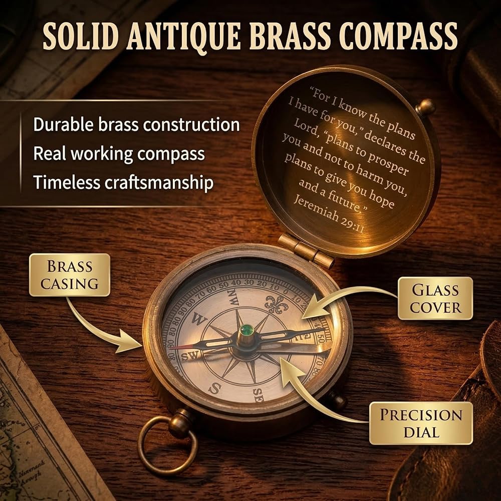 • 【بوصلة نحاسية عتيقة تعمل】بوصلة نحاسية صلبة مدمجة مقاس 1.96 بوصة مع إبرة عملية تشير إلى الشمال المغناطيسي. متينة وسهلة القراءة ومصنوعة للحمل اليومي في حقيبتها الجلدية المنقوشة، وتجمع بين الحرفية والرمزية المستوحاة من الإيمان.