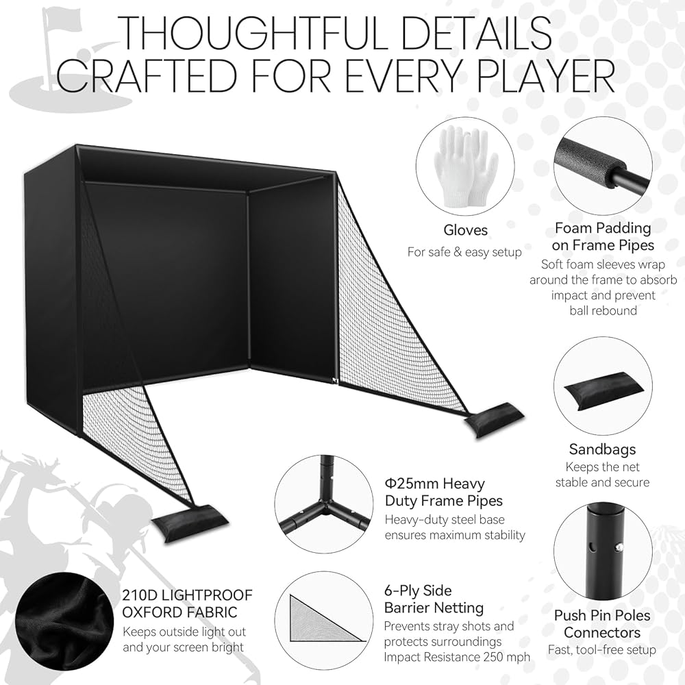 مساحة أكبر للتأرجح، مساحة أكبر للمرح: تمنحك حاوية شريحة الجولف الواسعة مقاس 10 × 8 أقدام الثقة للتأرجح بحرية والتحرك بشكل مريح، مما يجعلها مثالية لجلسات التدريب واللعب غير الرسمي والترفيه الجماعي.