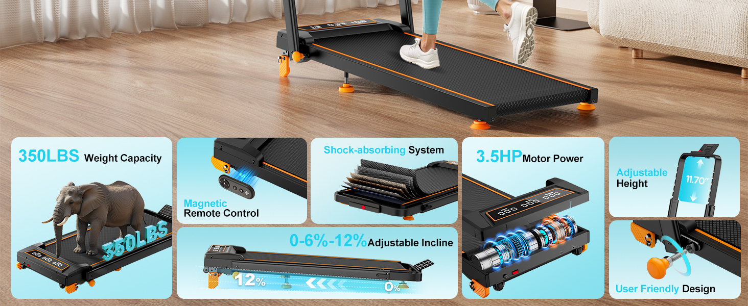 ⚡ 【محرك هادئ قوي بقوة 3.5 حصان】 تم تصميم جهاز المشي المحمول هذا بقوة 3.5 حصان والذي تم تصميمه خصيصًا للأداء، ويدعم ما يصل إلى 350 رطلاً ويصل إلى سرعات تصل إلى 6 ميل في الساعة. يضمن المحرك القوي التشغيل السلس مع الحفاظ على الضوضاء أقل من 40 ديسيبل، مما يجعله مثاليًا للاستخدام في الشقق أو المكاتب دون إزعاج الآخرين.