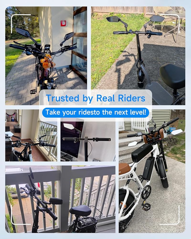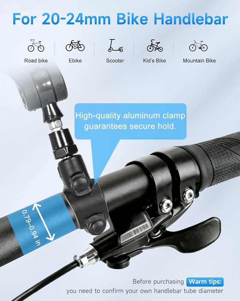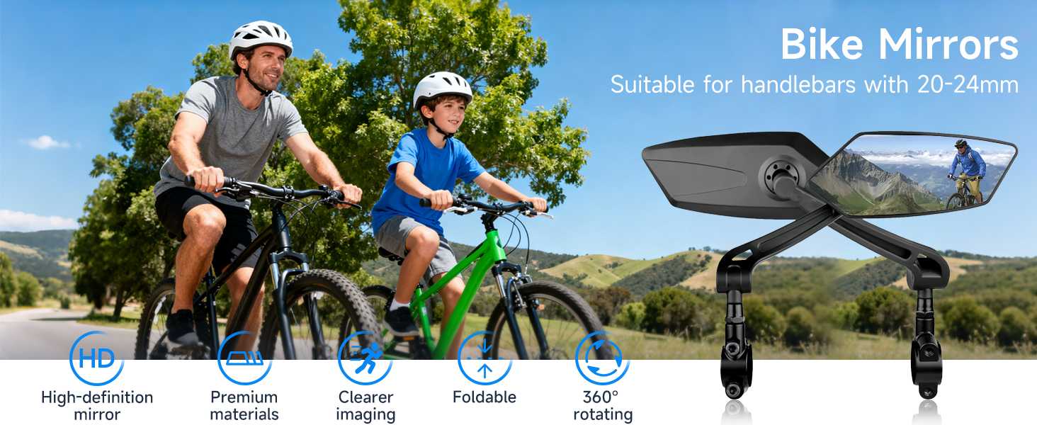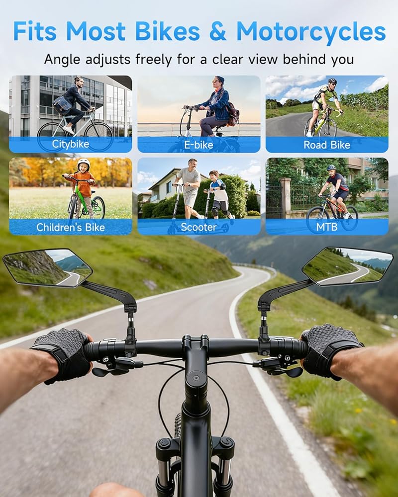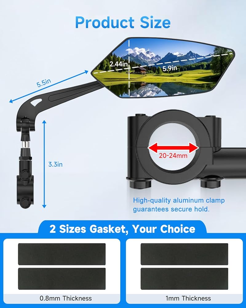 【نطاق الاستخدام】مرآة الدراجة مناسبة للمقود بقطر 0.79-0.94 بوصة (20-24 مم)، مناسبة تمامًا للدراجات أو الدراجات الإلكترونية، مثل الدراجات الجبلية والدراجات الكهربائية ودراجات الطرق ودراجات الركاب الحضرية والدراجات القابلة للطي والدراجة ثلاثية العجلات والدراجات الكهربائية ودراجات المدينة.