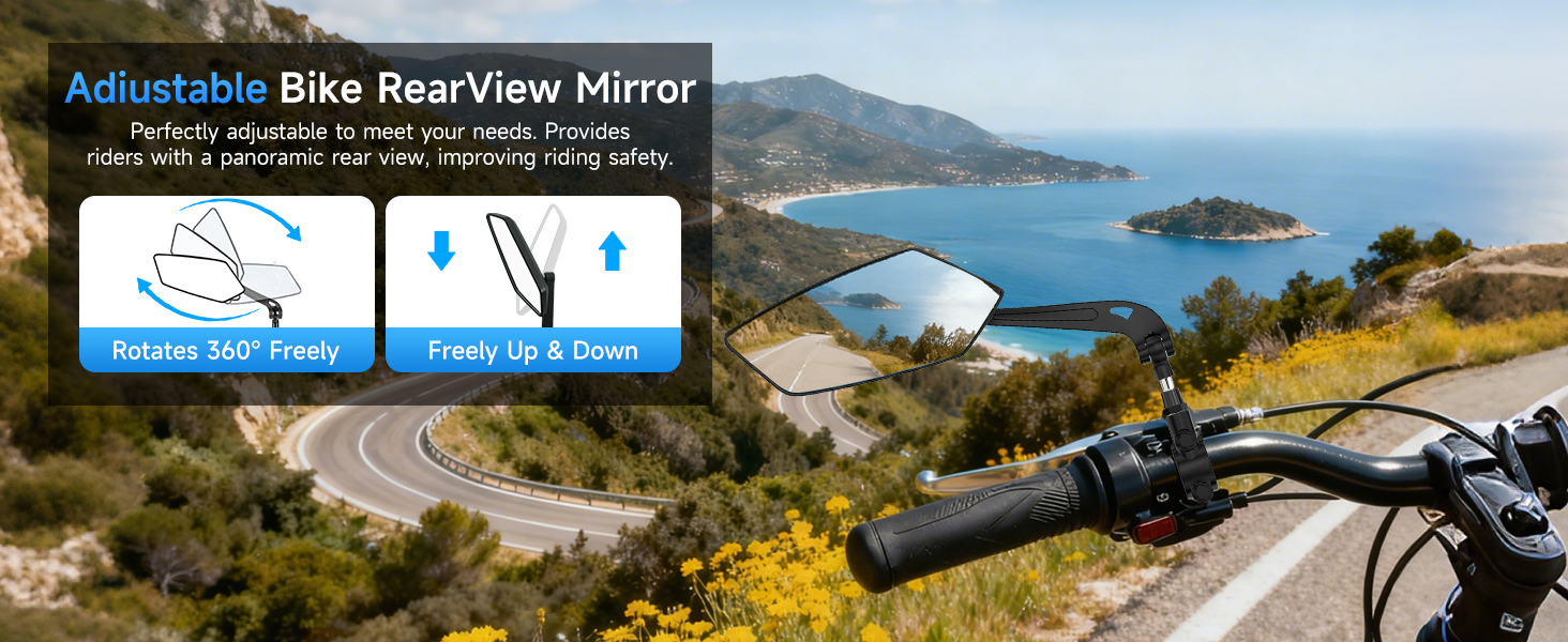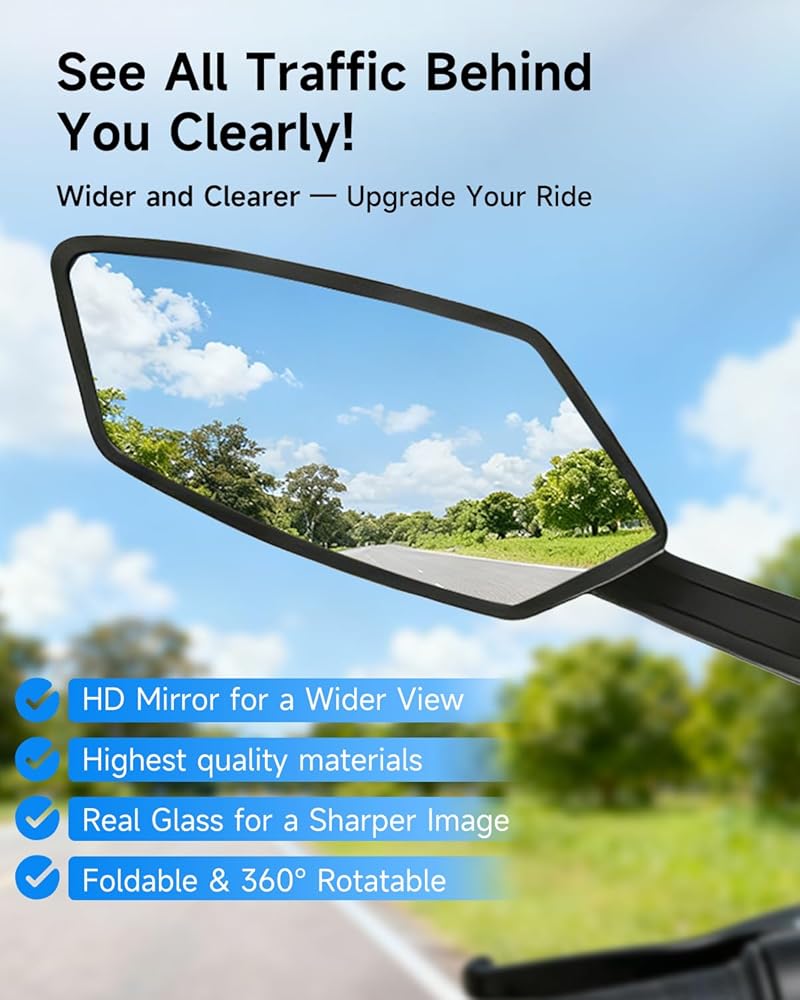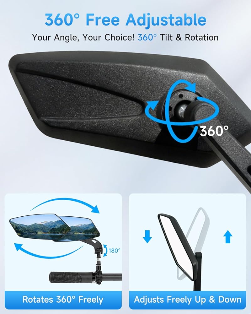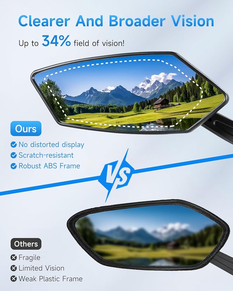 【سلامة معززة للركوب】 تتميز مرآة الرؤية الخلفية للدراجة بزجاج عالي الجودة من فئة السيارات (15 × 6.2 سم) مع نقل الضوء العالي ومقاومة الخدش، مما يوفر رؤية خلفية واضحة وواسعة. وبالتالي تقليل البقع العمياء بشكل فعال. مما يسمح لك بمراقبة حركة المرور خلفك دون أن تدير رأسك. تفاعل بشكل أسرع مع ظروف الطريق المتغيرة واستمر في التركيز للحصول على رحلة أكثر أمانًا وراحة.