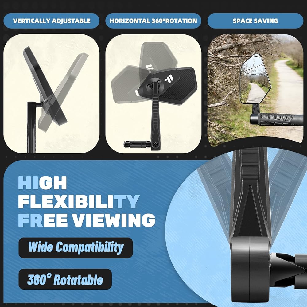 • تصميم قابل للتعديل والطي بزاوية 360 درجة - اعثر على منظرك المثالي مع دوران 360 درجة وتعديل الإمالة. يمكن طي مرآة نهاية قضيب الدراجة هذه إلى الداخل عند التنقل في المساحات الضيقة. مرونة عالية تتكيف مع أي وضعية أو وضعية ركوب.