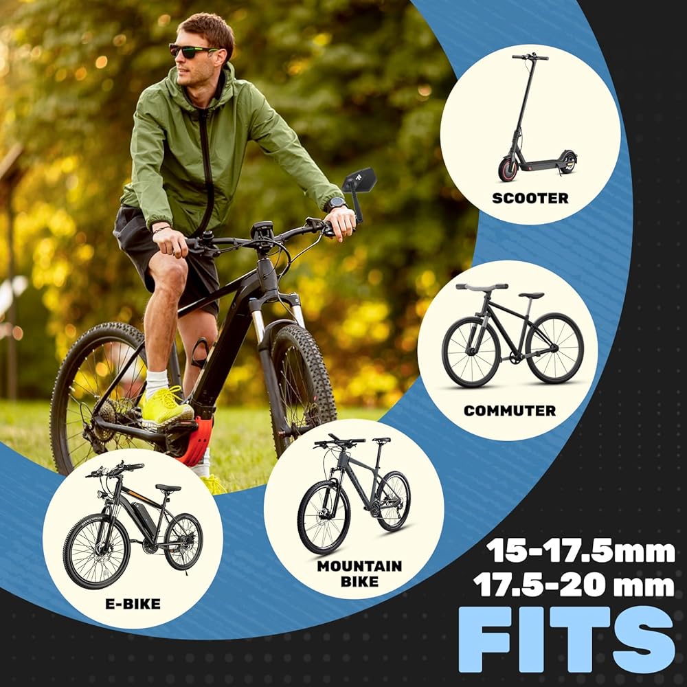• توافق عالمي - يناسب المقاود ذات القطر الداخلي 15-20 مم، مما يجعلها مثالية للدراجات والدراجات الإلكترونية والدراجات البخارية والمزيد. مرآة واحدة تعمل لركوب الخيل المتعددة، ولا يوجد أي صداع في التوافق.