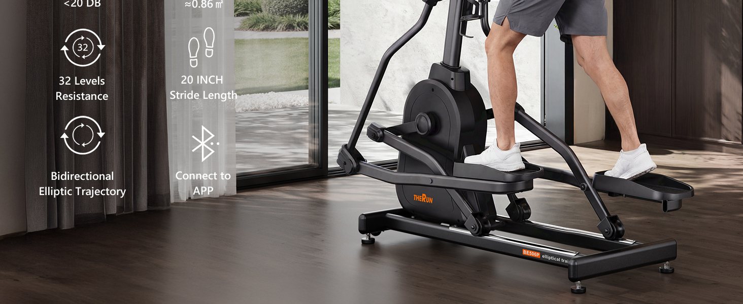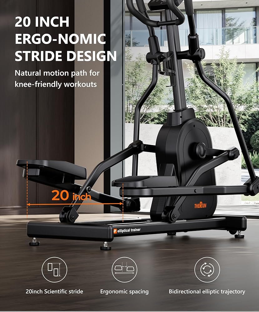 【20" Ergonomic Stride for Joint Protection】The THERUN Elliptical Exercise Machine features a 20-inch ergonomic stride with a biomechanically inclined front-drive design. This scientific trajectory ensures natural, low-impact movement that cradles your knees and hips. Unlike short-stride ellipticals that cause joint stress, our extended stride allows users from 4'9" to 6'4" to move freely while engaging glutes and hamstrings for safer, more effective full-body conditioning