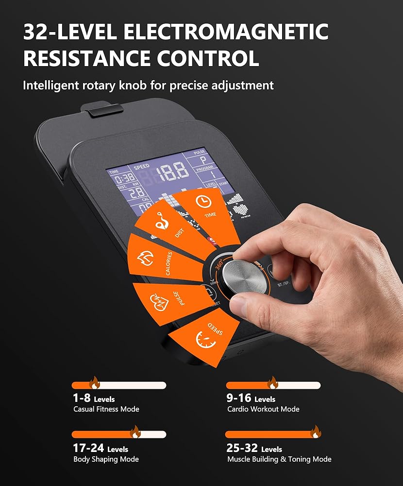 【32-Level Magnetic Resistance with Rotary Knob】Achieve clinical intensity control with 32 levels of advanced electromagnetic resistance. From gentle warm-ups to lung-burning climbs, simply twist the intuitive rotary knob for instant, precise adjustments. This level of customization lets you perfectly execute HIIT intervals, structured programs, or steady-state cardio, ensuring your Elliptical Machine for Home grows with your fitness journey