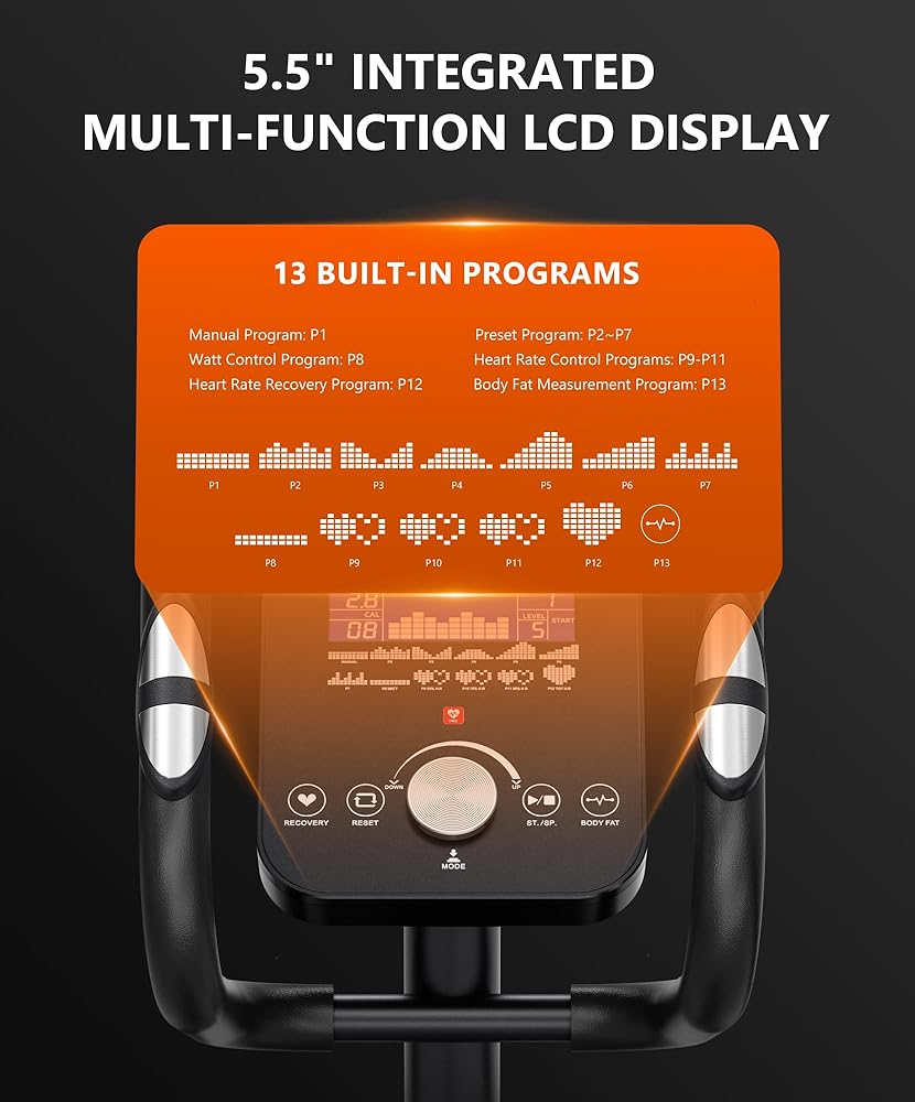 【13 Built-In Programs for Smart Training】 The integrated LCD Monitor tracks real-time metrics and features 13 goal-oriented programs: P1 Manual for free control; P2-P7 Preset for automatic hill intervals; P8 Watt Control for constant power output; P9-P11 Heart Rate Control for zone-based training; P12 Recovery Test to measure fitness gains; P13 Body Fat Measurement to track composition changes. Versatile intelligence for every goal
