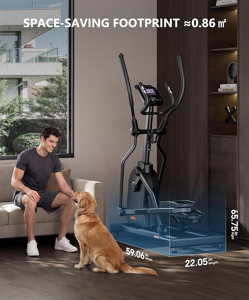【Compact 0.86㎡ Footprint with Easy Mobility】Maximize your living space without sacrificing performance. The THERUN Elliptical boasts a space-saving footprint of just 0.86 square meters, making it ideal for apartments and small home gyms. Integrated transport wheels allow effortless relocation—simply tilt and roll to store or move this robust machine wherever your workout takes you