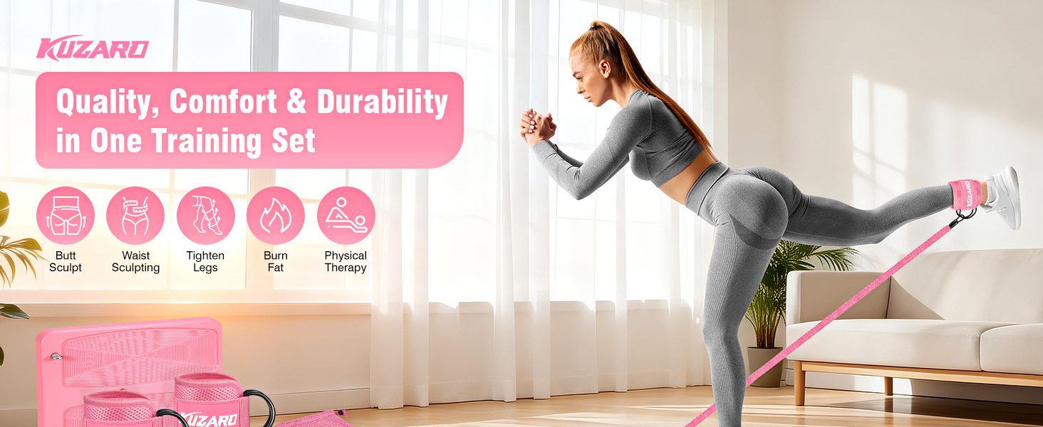 راحة وتحكم يشبهان الآلة: تتميز أحزمة مقاومة الكاحل المبطنة ببطانة عالية الكثافة لملاءمة ناعمة ومسامية وآمنة أثناء الركلات والحركات التي تركز على الساق. حلقات على شكل حرف D قابلة للتعديل تحافظ على ثبات أحزمة شريط المقاومة في مكانها من أجل توتر ثابت وحركة متحكم فيها. يضيف تصميم الشريط المعزز ثنائي الطبقة والقاعدة المضادة للانزلاق الأمان والمتانة والثبات على الأرض، مما يدعم التدريب السلس في أي صالة ألعاب رياضية منزلية.