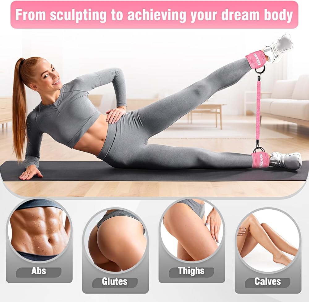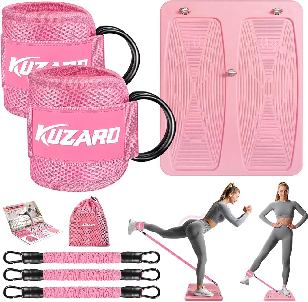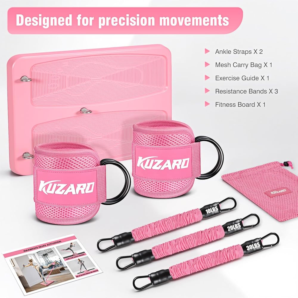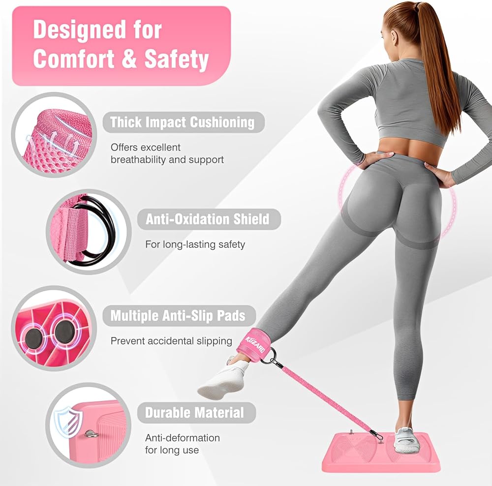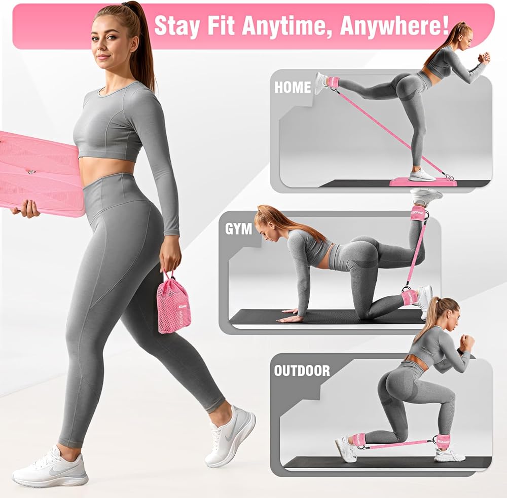معدات تمارين الغلوت، معدات تمرين الساق والورك للنساء، أشرطة مقاومة مع أشرطة للكاحل ولوحة تمرين للياقة البدنية في صالة الألعاب الرياضية المنزلية، الركلات، دفعات الورك، تدريب الجزء السفلي من الجسم