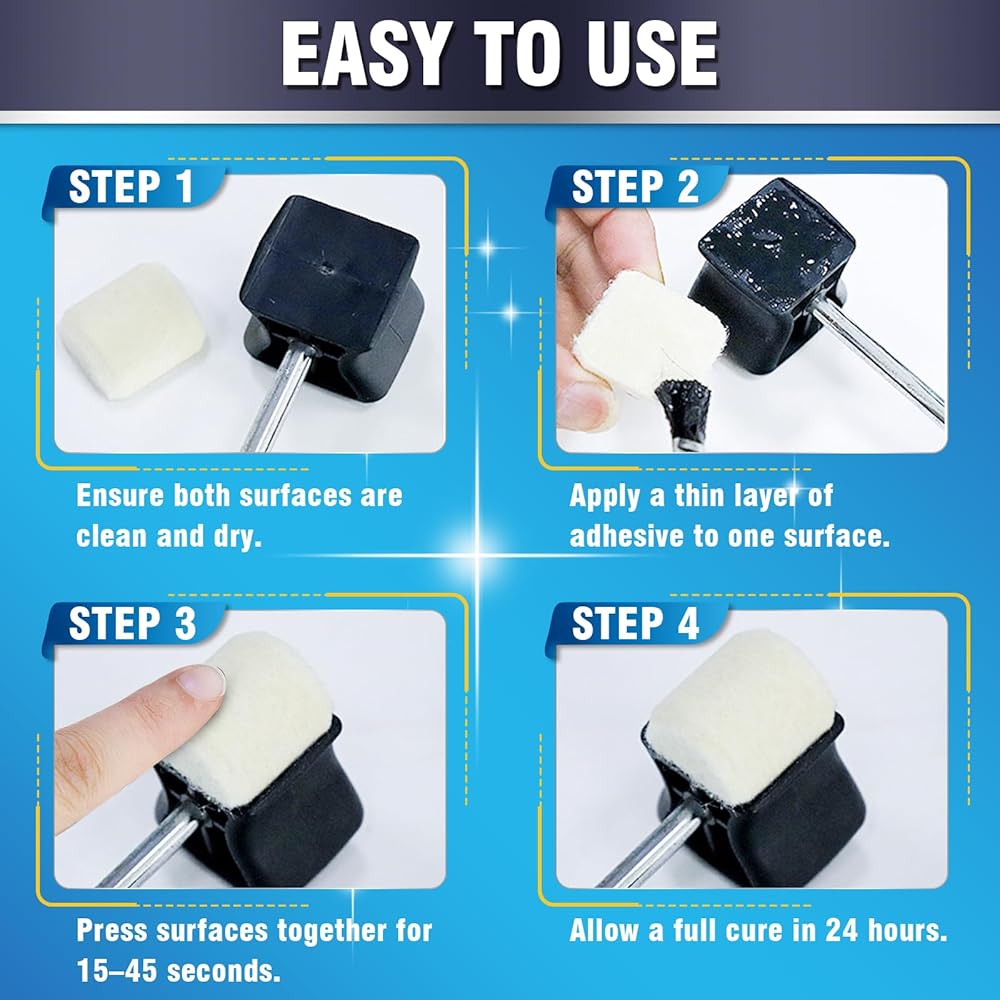 • سهولة الاستخدام: تأكد من أن كلا السطحين نظيفان وجافان. ضع طبقة رقيقة ومتساوية من الغراء اللاصق على سطح واحد باستخدام الفرشاة، ثم اضغط على الأجزاء معًا لمدة 15-45 ثانية لتحقيق رابطة فورية. اسمح بالعلاج الكامل خلال 24 ساعة للحصول على أقصى قدر من القوة والمتانة على المدى الطويل