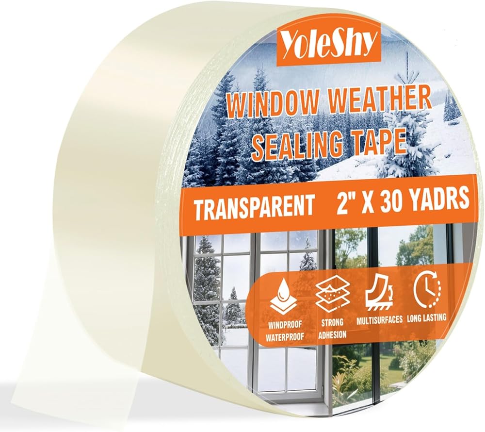 شريط عازل للطقس للنافذة الشفافة من YoleShy مقاس 5.08 سم × 30 ياردة، بدون بقايا، شريط عازل للنافذة شديد التحمل للأبواب في فصل الشتاء، مقاوم للبرودة، وختم نافذة مكيف الهواء