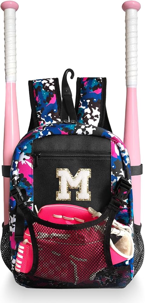 This youth sports backpack is designed for T-ball, softball, and baseball, combining durable storage with personalized style for girls ages 3–16.