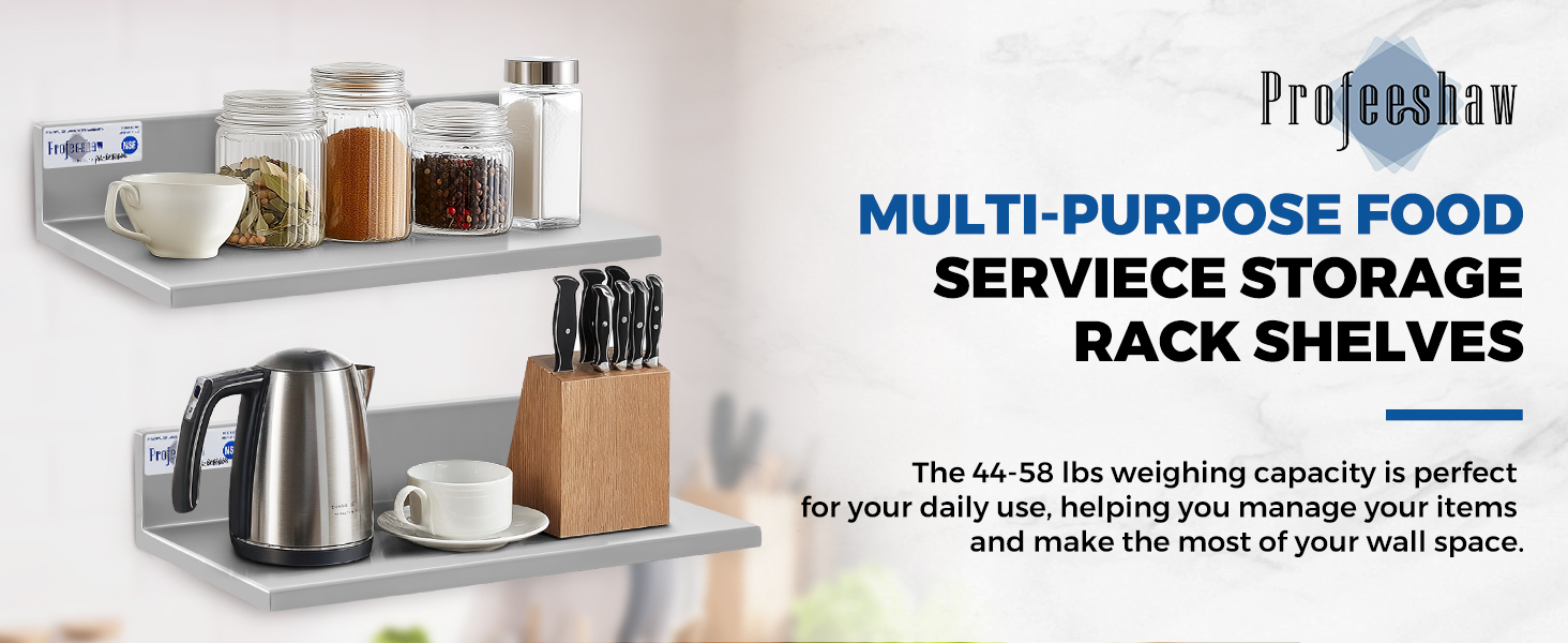 • سعة تجارية: كل رف من الفولاذ المقاوم للصدأ يدعم 58 رطلاً، مما يوفر تخزينًا موثوقًا للتوابل والأطباق وأدوات الطهي ومستلزمات التنظيف. مثالي للمطاعم والحانات والفنادق المزدحمة التي تتطلب الكفاءة والتنظيم