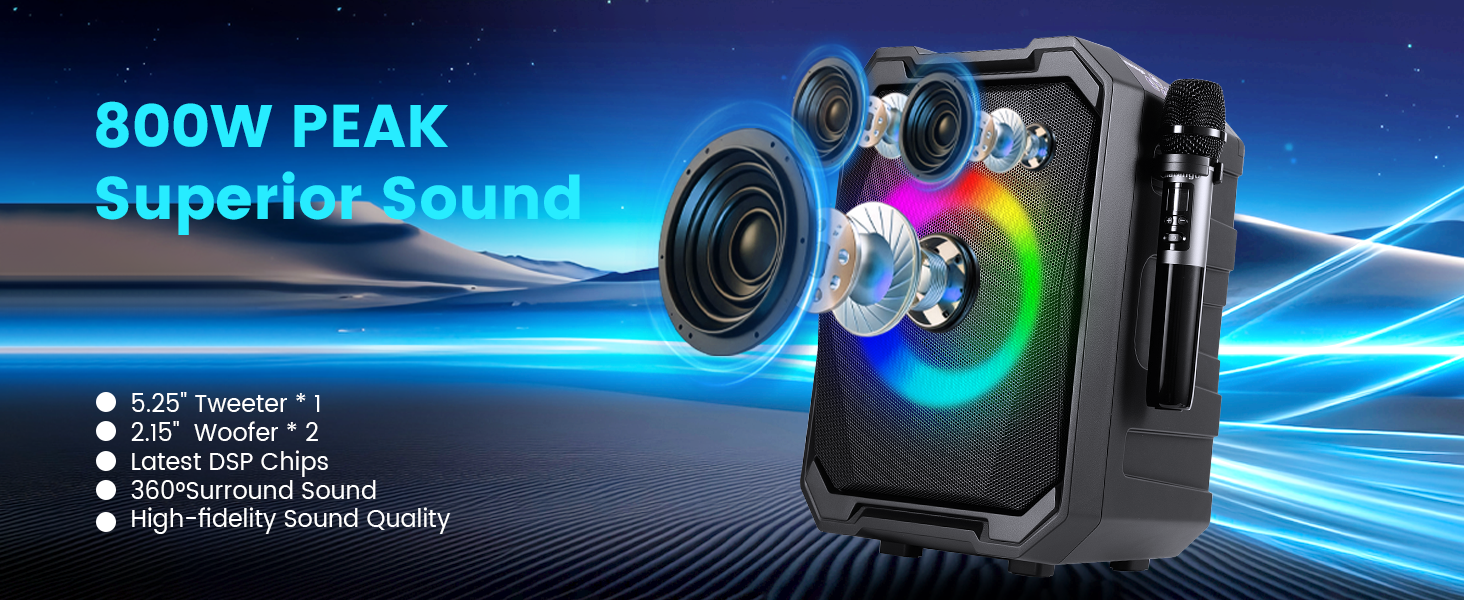 【صوت قوي 80 واط وجهير عميق】صوت قوي 80 واط وجهير عميق مزود بمكبر صوت عالي الأداء 1 × 5.25 بوصة ومكبرات صوت 2 × 2.15 بوصة، يوفر مكبر الصوت هذا صوتًا غنيًا وصوتًا واضحًا ومتوازنًا. يضمن الإخراج القوي بقدرة 80 واط (ما يصل إلى 800 واط من الطاقة القصوى) مع تقنية الفصل الجهير والثلاثي تجربة كاريوكي وموسيقى غامرة.