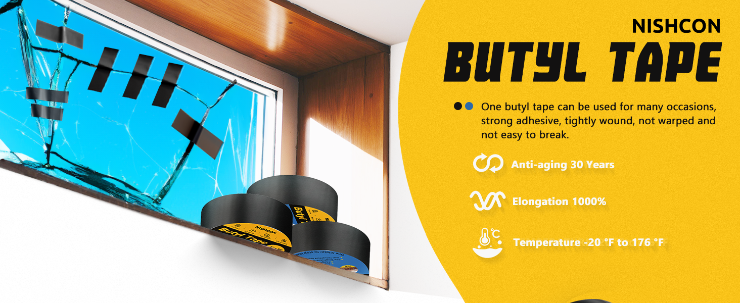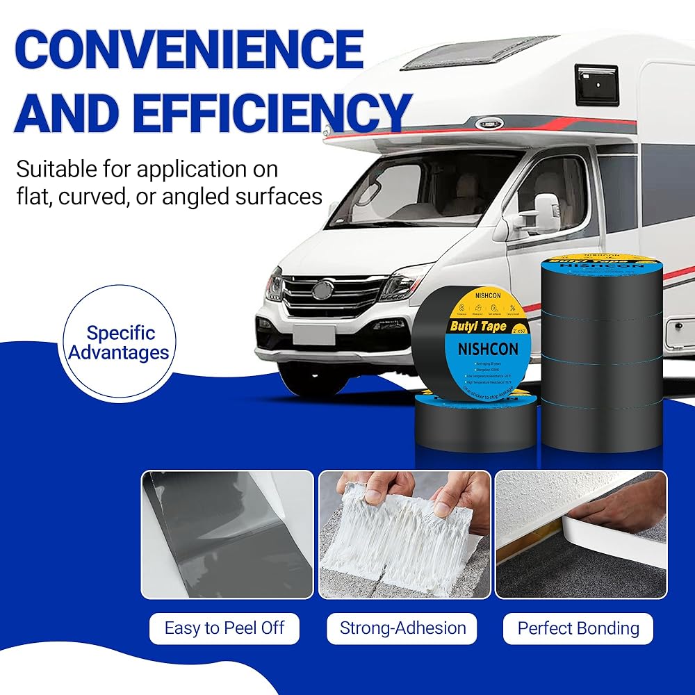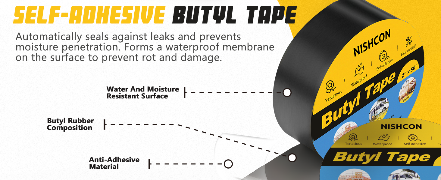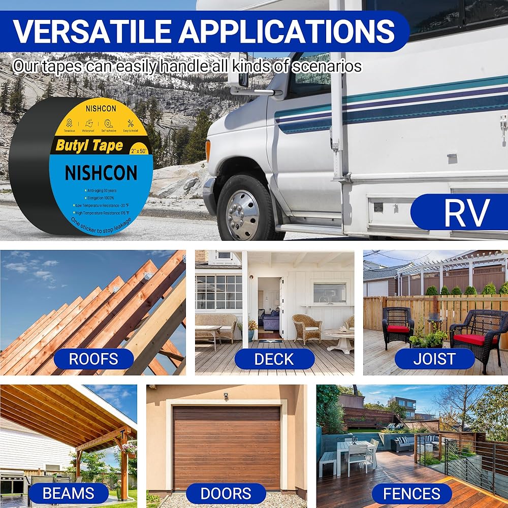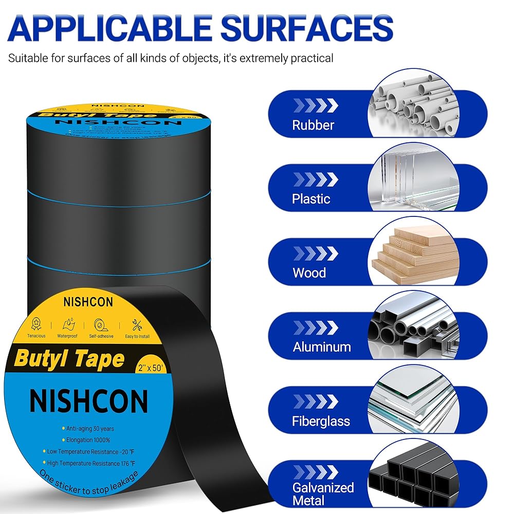 تطبيقات متعددة: يمكن استخدام شريط البوتيل الخاص بنا على مجموعة متنوعة من الأسطح بما في ذلك الخشب والمعدن والبلاستيك والمطاط. إنه مثالي للإصلاحات على سطح السفينة، والروافد، والأسقف، والعوارض، والمركبات الترفيهية، والأبواب، والأسوار. تذكر تنظيف السطح وتجفيفه قبل استخدام شريط تسرب البوتيل