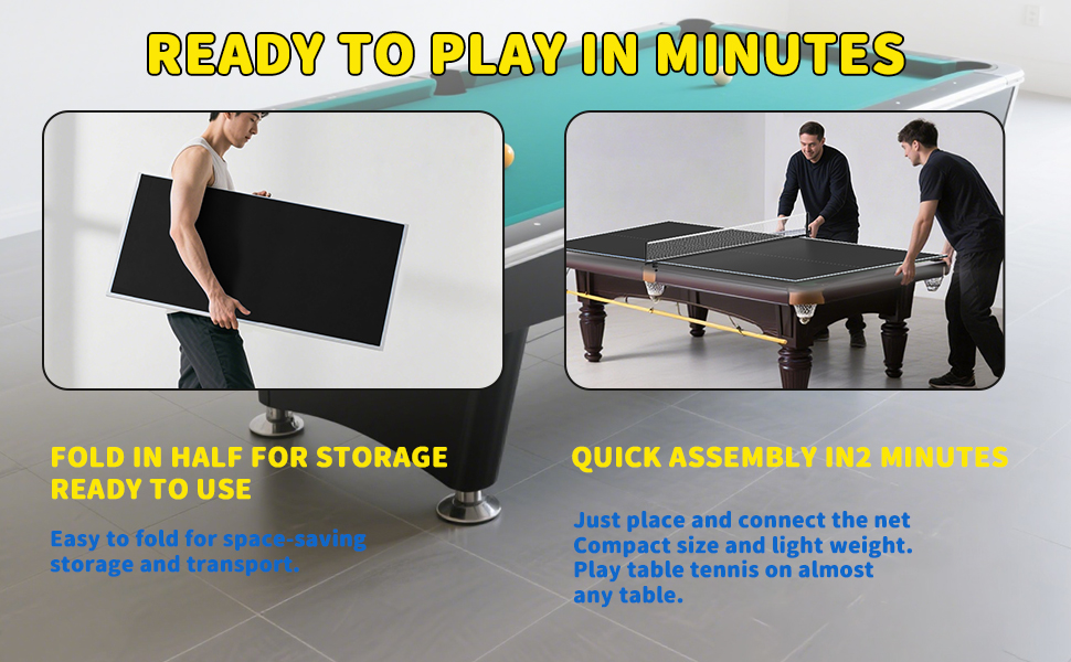 تحويل أي طاولة: قم بتحويل طاولة البلياردو أو الطعام أو النزهة الخارجية الخاصة بك إلى طاولة تنس بسمك 12 مم، مقاس تنظيم (8 × 4 أقدام) / 96 × 48 × 30 بوصة في دقائق معدودة! توفر ترفيهًا لا نهاية له لك ولعائلتك أثناء وقت فراغك