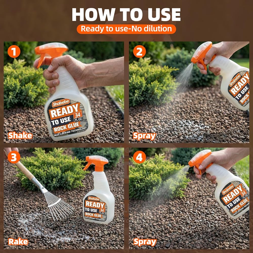 • 1️⃣ READY-TO-USE — NO MIXING, NO MESS: Skip measuring, diluting, and guesswork. Shabebe Rock Glue comes pre-mixed and ready to spray—just shake, pour into the sprayer, and apply. Perfect for quick landscaping fixes and first-time DIY users who want instant results without hassle.Note:Package include 32.58OZ small bottle, ideal for very small areas or testing purposes.