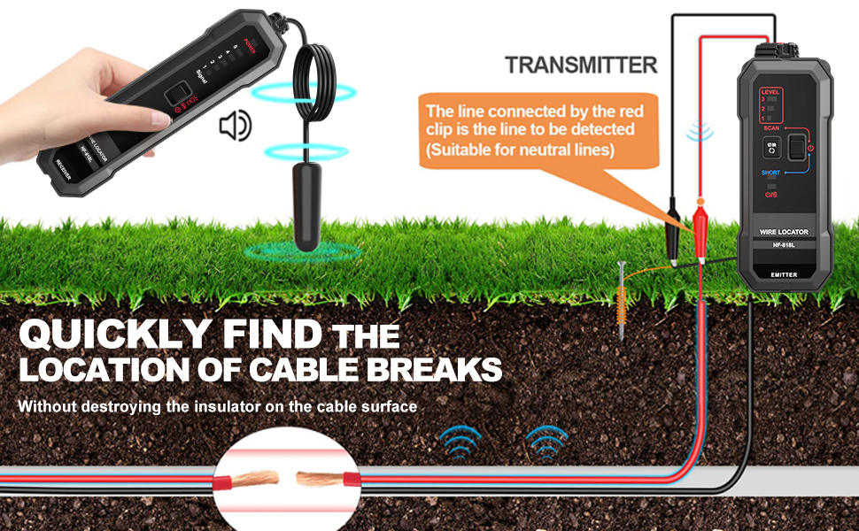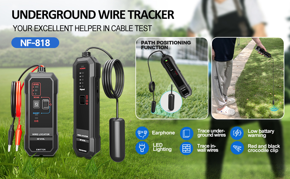 التكوين باستخدام مصباح LED وسماعات الرأس: يمكن استخدام ضوء LED الموجود في محدد موقع الكابل تحت الأرض في الليل أو في البيئات المظلمة. تأتي مع سماعات أذن، يمكنك توصيل سماعات الأذن بجهاز الاستقبال للحصول على موضع دقيق في البيئات الصاخبة، وقد تم اختبار محدد موقع الأسلاك المدفونة NF-818L بدقة قبل التسليم ويمكن أن يعمل في الظروف الجوية القاسية