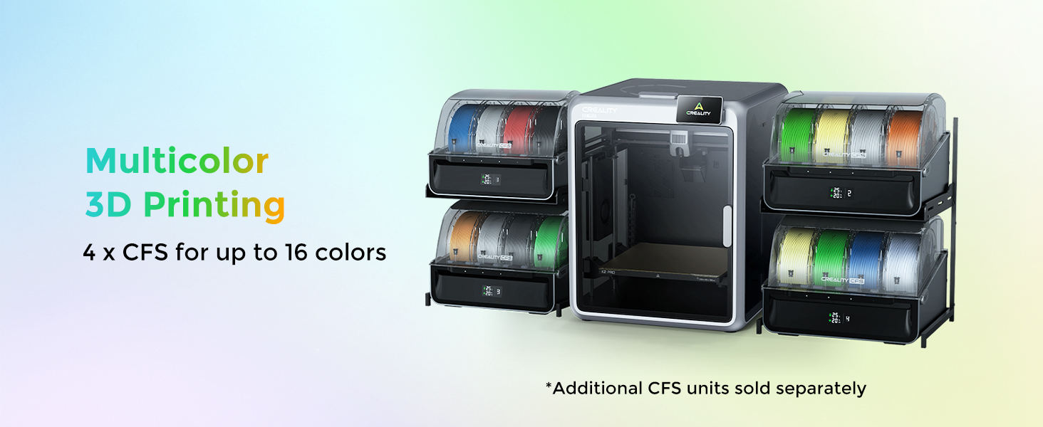 طباعة متعددة الألوان: طابعة Creality K2 Combo ثلاثية الأبعاد، تتحد مع طابعة K2 ثلاثية الأبعاد وCFS. والتي يمكن أن تلبي الطباعة متعددة الألوان، ويمكن طباعة ما يصل إلى 16 لونًا معًا. تعد الطباعة بلون واحد أمرًا مملاً، فهذه الطابعة تقدم لك تجربة جديدة في مهمة الطباعة، مما يزيد من متعة حياتك. إدارة ذكية لخيوط متعددة، لا تقلق بشأن طلاء مطبوعاتك