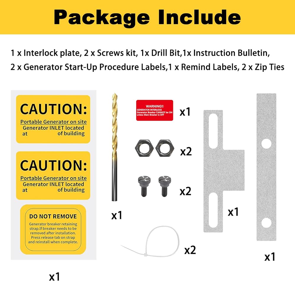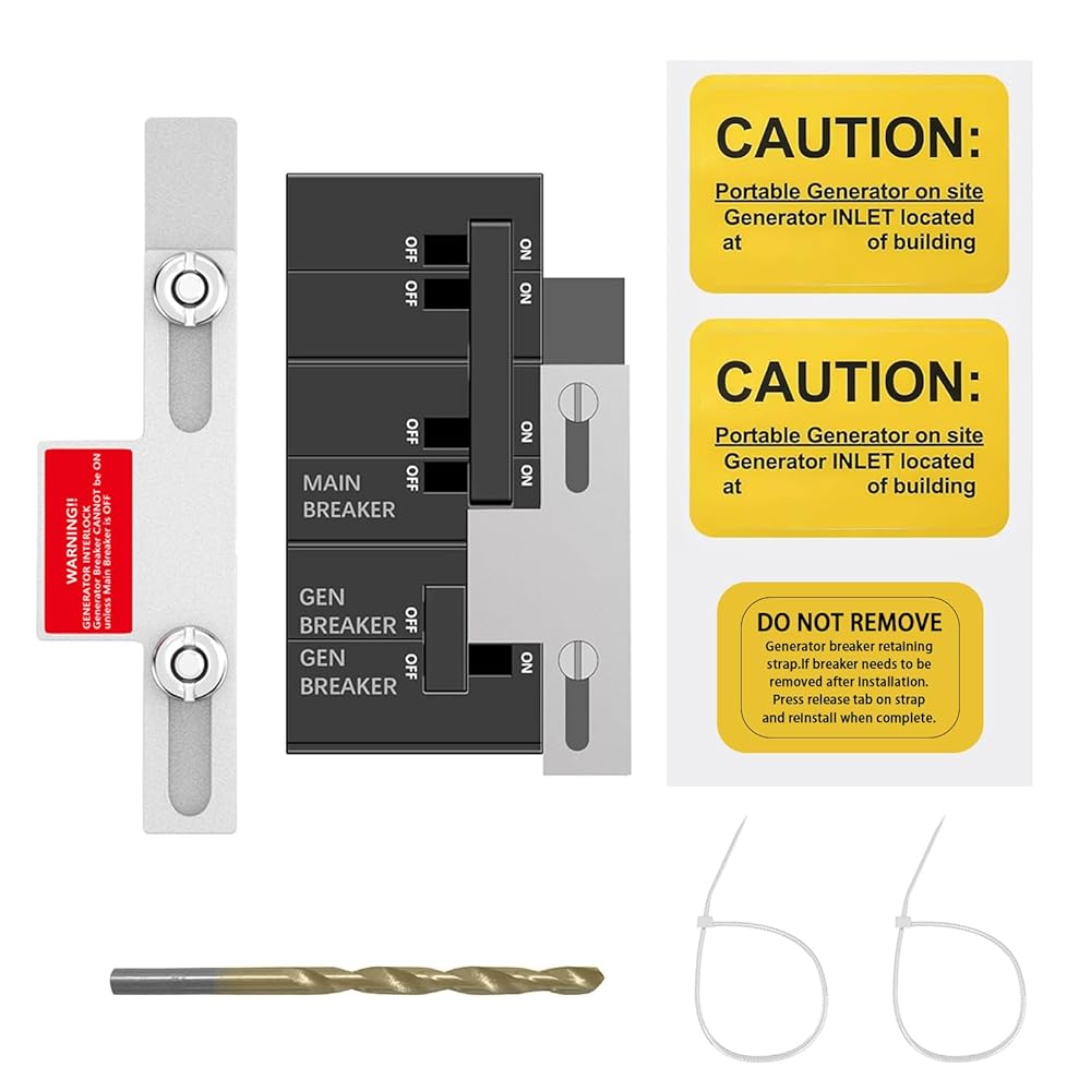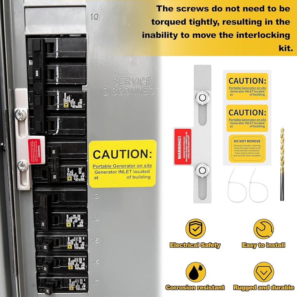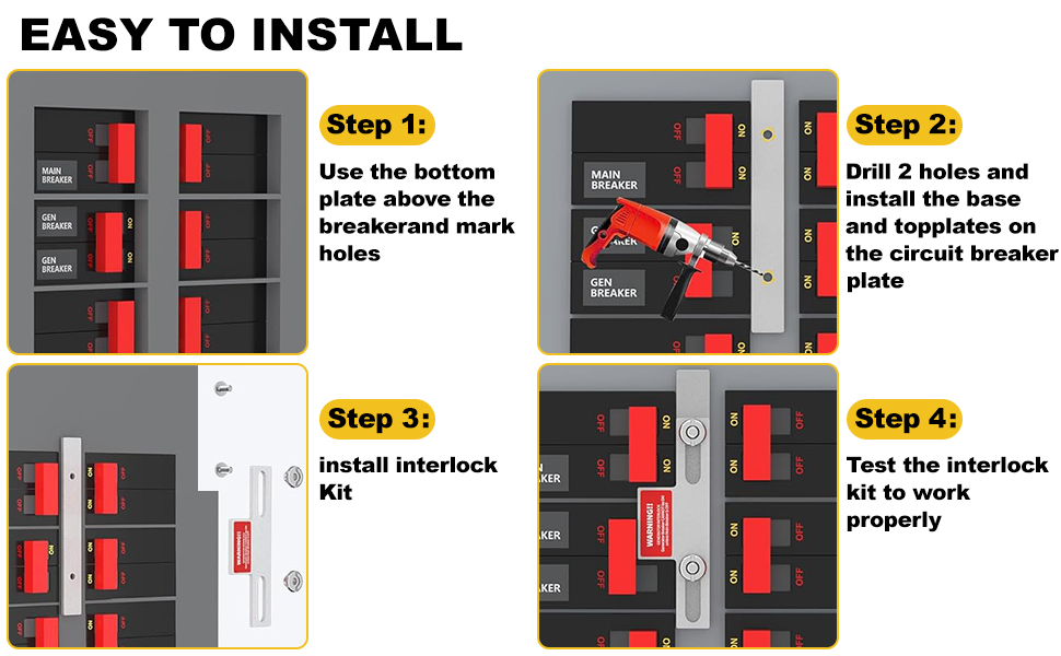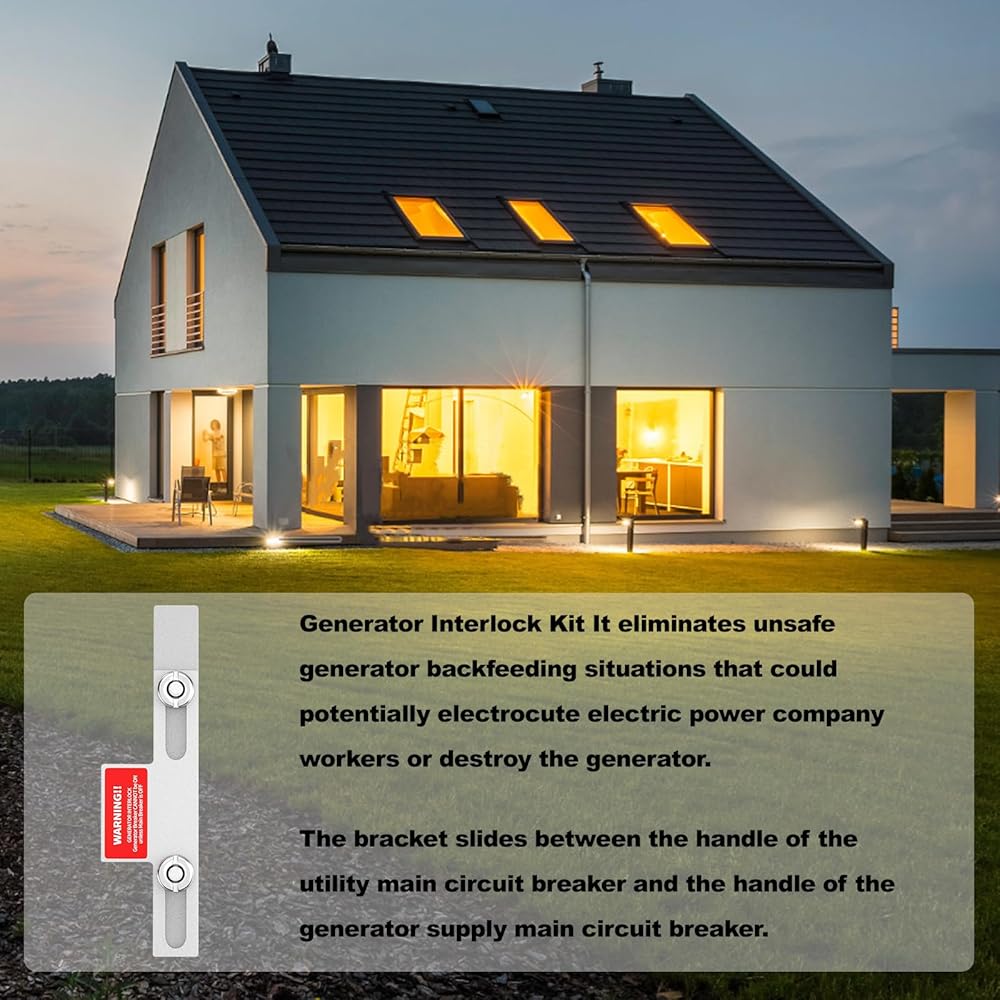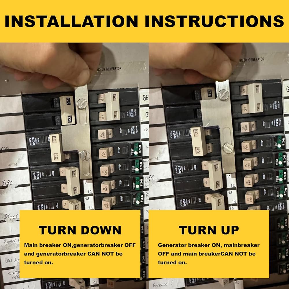 ملاحظة التثبيت: قبل تثبيت مجموعة التعشيق، قم بتوصيل البراغي بمجموعة التعشيق أولاً. قم بتوصيل المولد بلوحة Eaton أو Cutler Hammer الكهربائية وتأكد من عدم تشغيل القاطع الرئيسي مطلقًا أثناء تشغيل قاطع المولد، لا يتحرك بسلاسة عند التشغيل فحسب، بل يتلف الأجهزة الكهربائية أثناء انقطاع التيار الكهربائي