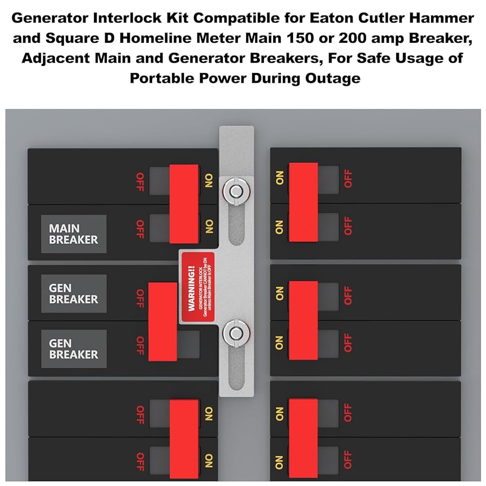 طقم تعشيق المولد متوافق مع مطرقة Eaton Cutler وعداد Homeline Square D الرئيسي 150 أو 200 أمبير، قواطع رئيسية ومولدات مجاورة، للاستخدام الآمن للطاقة المحمولة أثناء انقطاع التيار الكهربائي