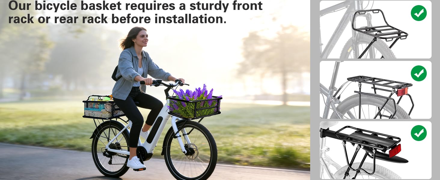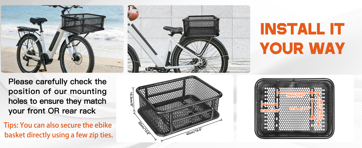 • سهلة التركيب: يرجى التحقق بعناية من موضع فتحات التثبيت لدينا للتأكد من أنها تتوافق مع الرفوف الأمامية أو الخلفية. إذا لم تكن متطابقة، يمكنك أيضًا تأمين السلة مباشرةً ببضعة أربطة مضغوطة.